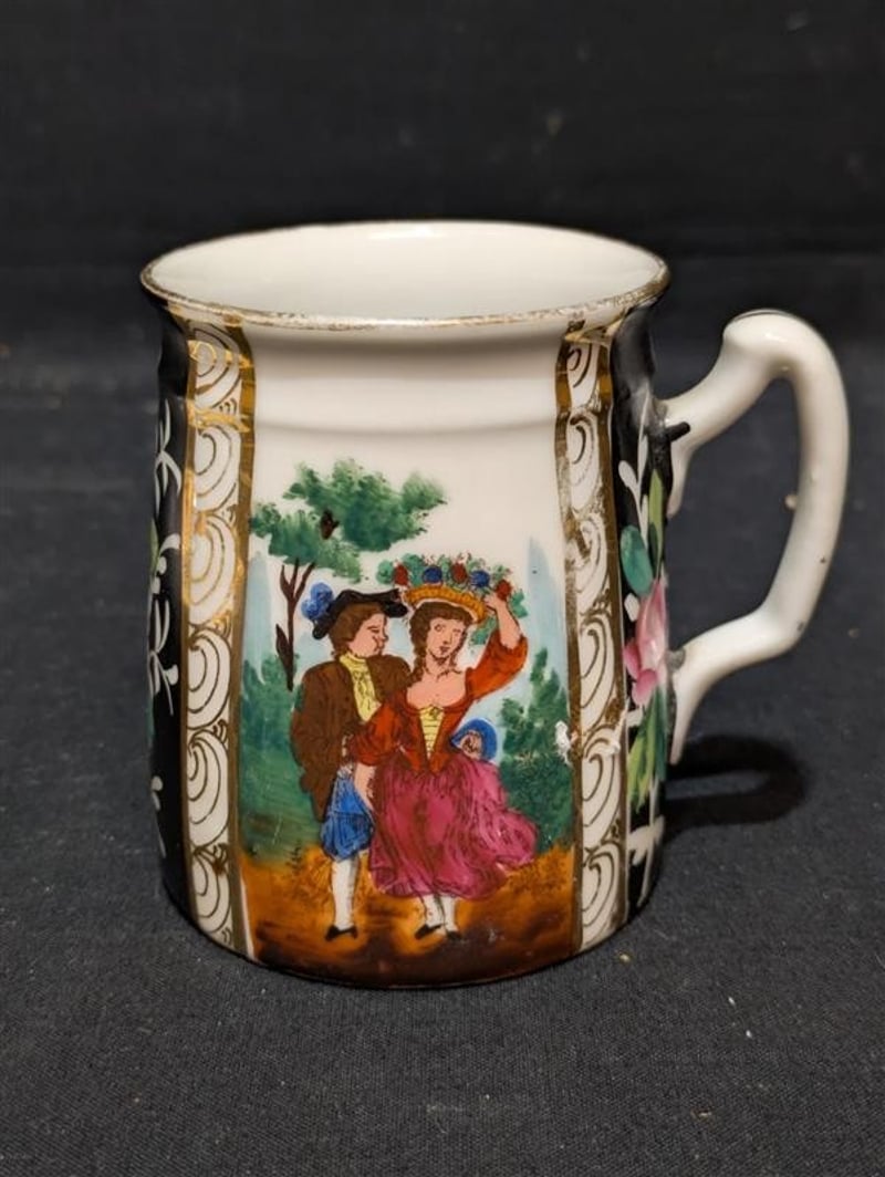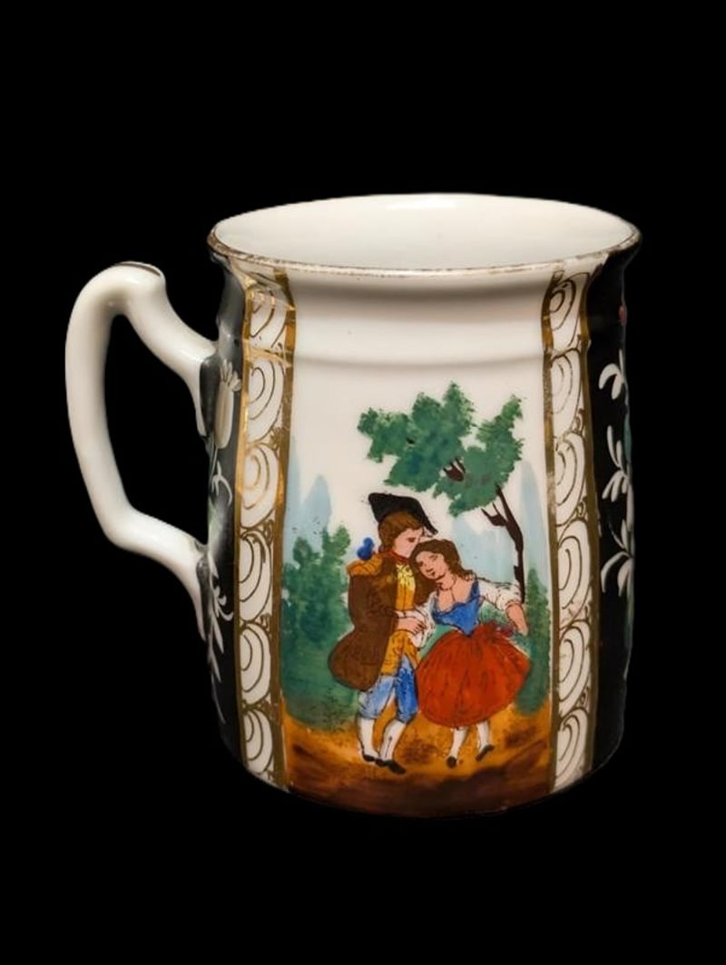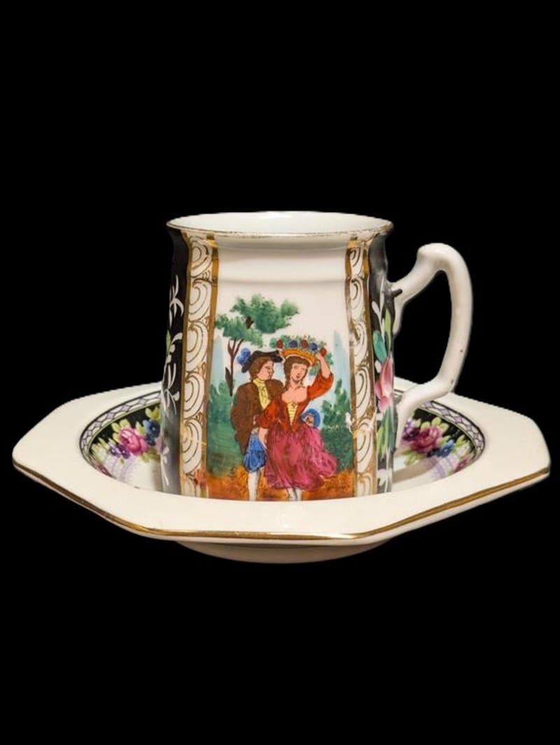 VINTAGE HAND-PAINTED PORCELAIN CUP AND SAUCER – COURTING COUPLE DESIGN