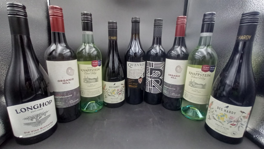 Bubdle of wine, pinot Noir, Pinot Gris, Kisi and more 2x 2024, Pinot Noir, Bec Hardy, Garden series 750ml2x 2023, Pinot Gris, Knappstein, Clare Valley 750ml2x 2021, Montepulciano, Organic Hill 750ml1x 2023, Old Vine Grenache, Longhop 750ml1x 2019, the creek, Angas & Bremer 750ml1x 2015, kisi, Tbilvino 'Qvevris' 750ml Sold as lot