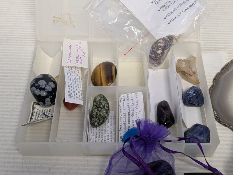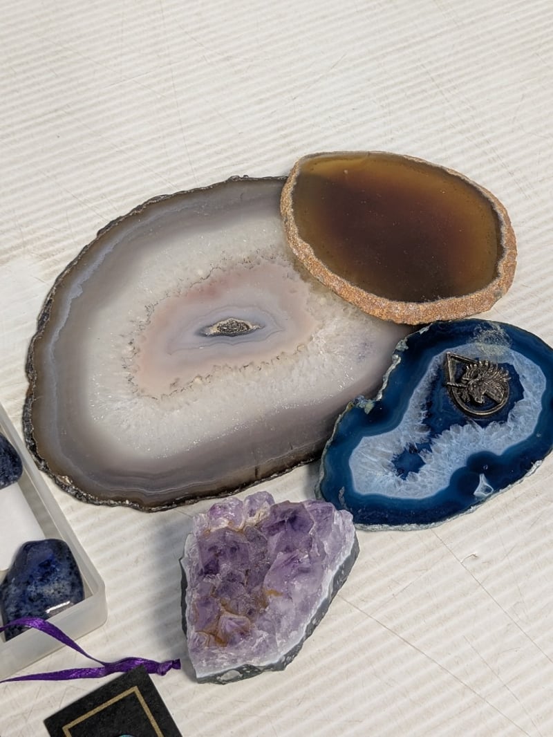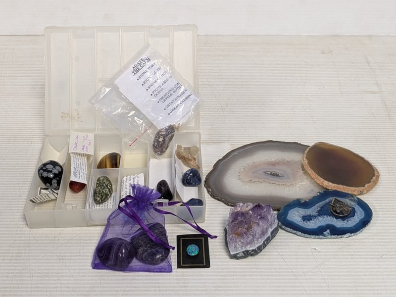 Stones, including Agate slices, amethyst crystal and more Sold as lot