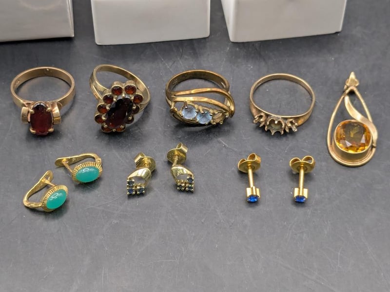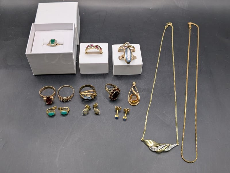 Jewellery, gold style 333, 375, 9CT and more stamped includes earring pairs, rings and necklacesInspection recommended Sold as lot