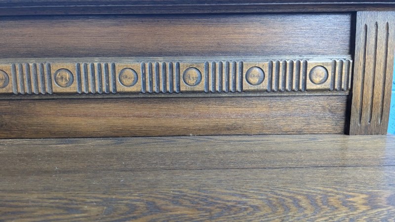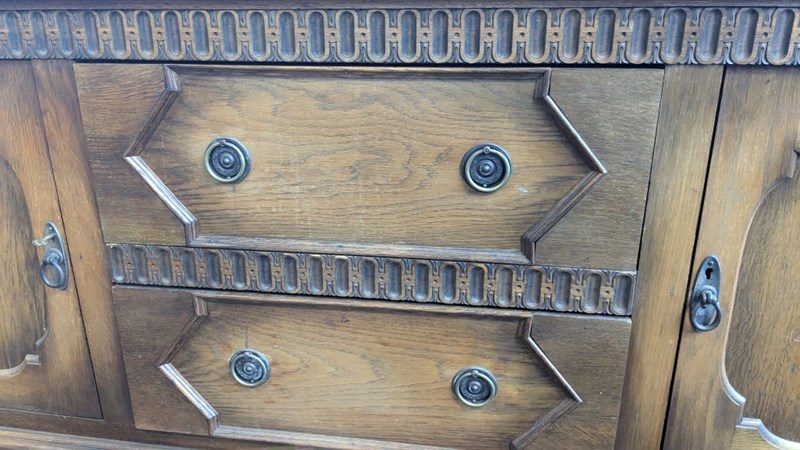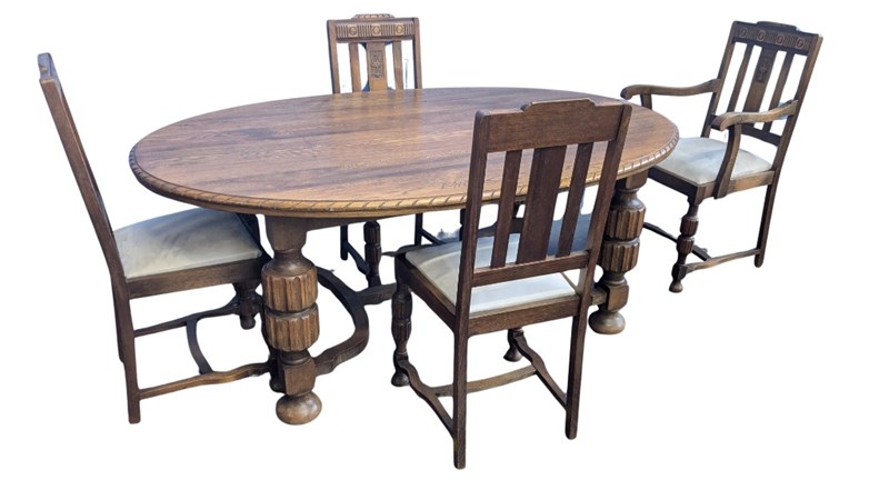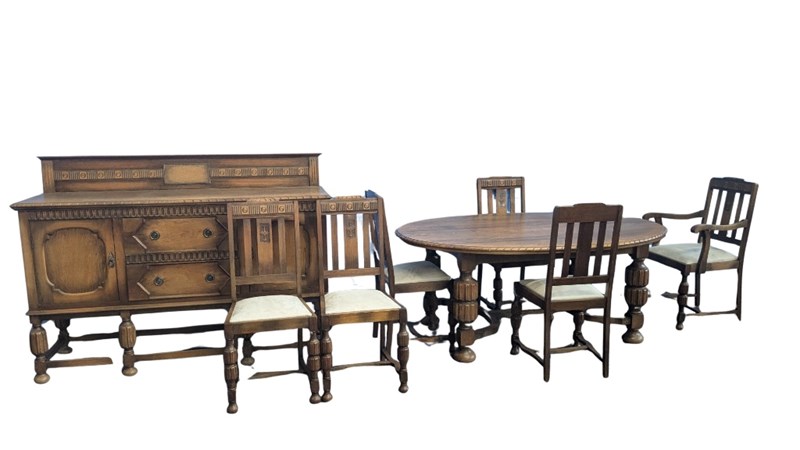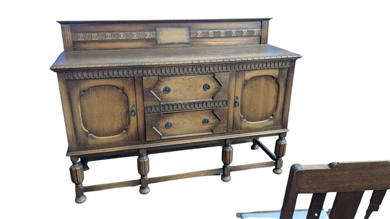ANTIQUE TABLE CHAIRS AND BUFFET, STAMPED WITH A HALLMARK FOR A. PENGELLEY & CO A MANUFACTURER OF FURNITURE, HORSE-DRAWN VEHICLES, MOTOR CAR BODIES AND TRAM AND RAILWAY ROLLING STOCK BODIES IN ADELAIDE, SINCE 1910, SOUTH AUSTRALIA. THE COMPANY HAD A 3-ACRE FACTORY ON SOUTH ROAD, EDWARDSTOWN.TABLE DIMENSIONS 74CM H X 122CM W X 183CM D CHAIR DIMENSIONS 102CM H X 45CM W X 46CM D BUFFET DIMENSIONS 122CM H X 168CM W X 53CM DCondition: Vintage711162+1