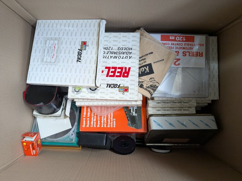 Film, including 8mm projector, dual 8 movie editor, reels and more Sold as lot