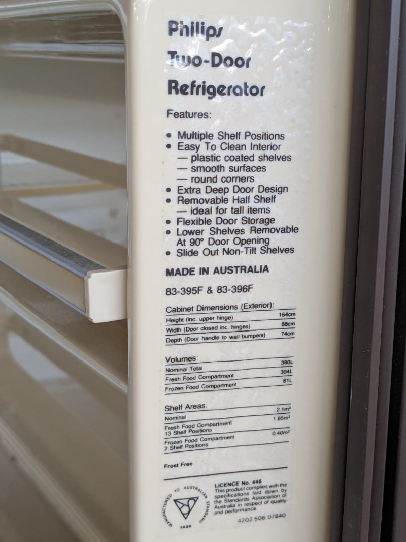 Refrigerator, Phillips 390L freezer/ fridge model no. 83-395F