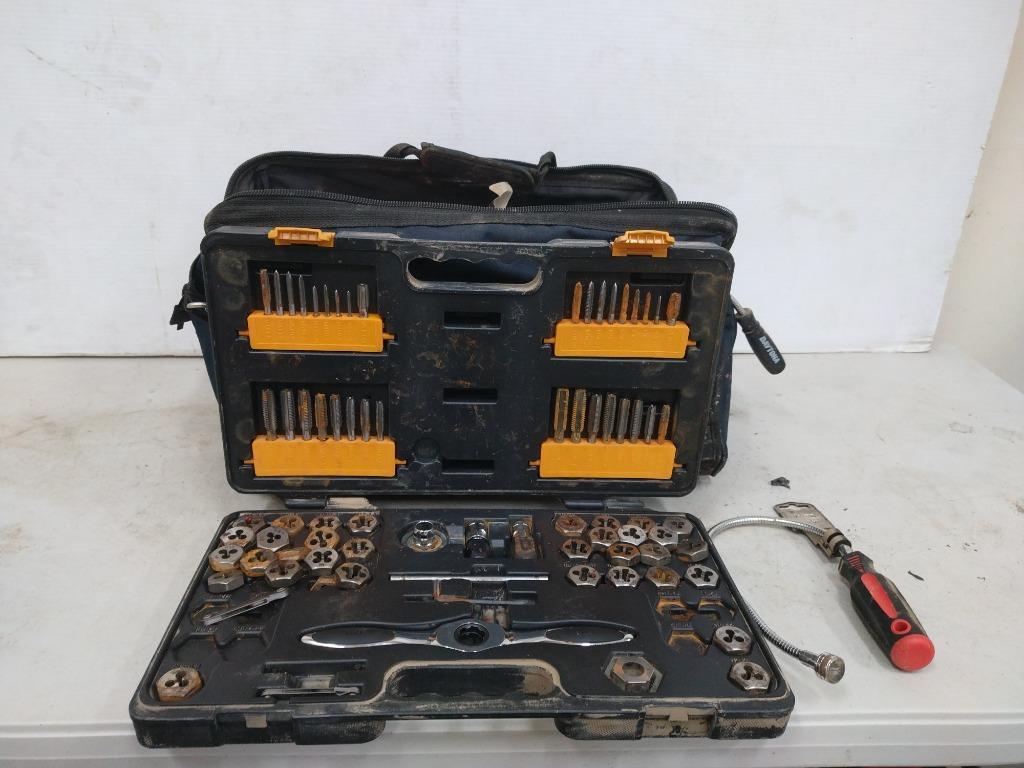 Assorted Tool Lot, Including, Tap And Die Kit, Flexible Magnetic tool, Bosch Tool BagSOLD AS LOT, Some Parts Missing