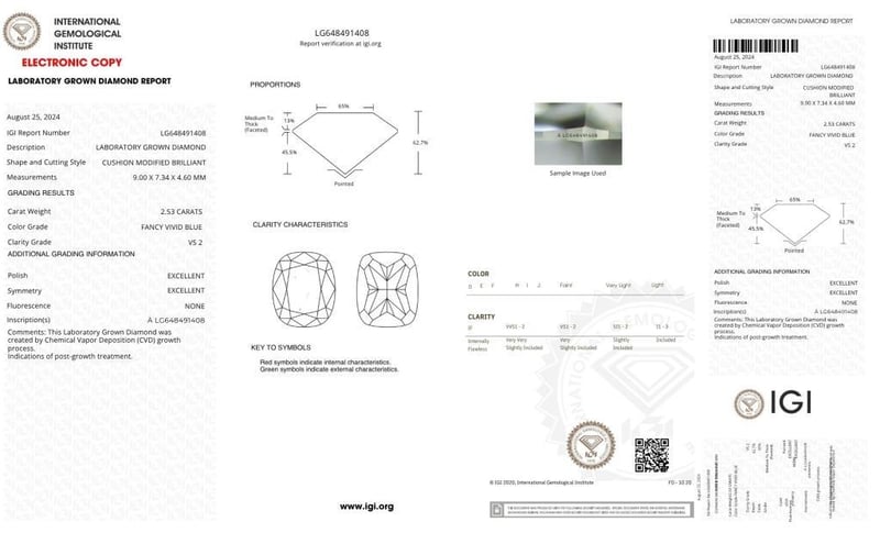 Igi Certificate # Lg 648491408 Laser Inscribed : Labgrown Igi Lg 648491408 Polish : Excellent Symmetry : Excellent Flourescence : None Type : Cvd