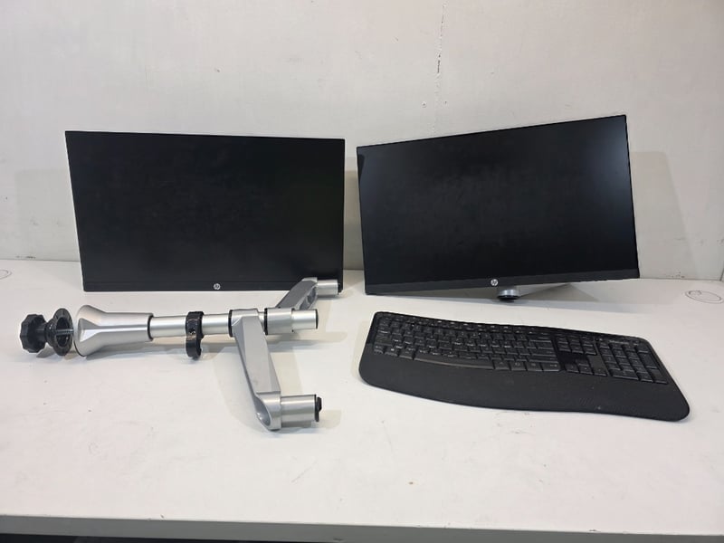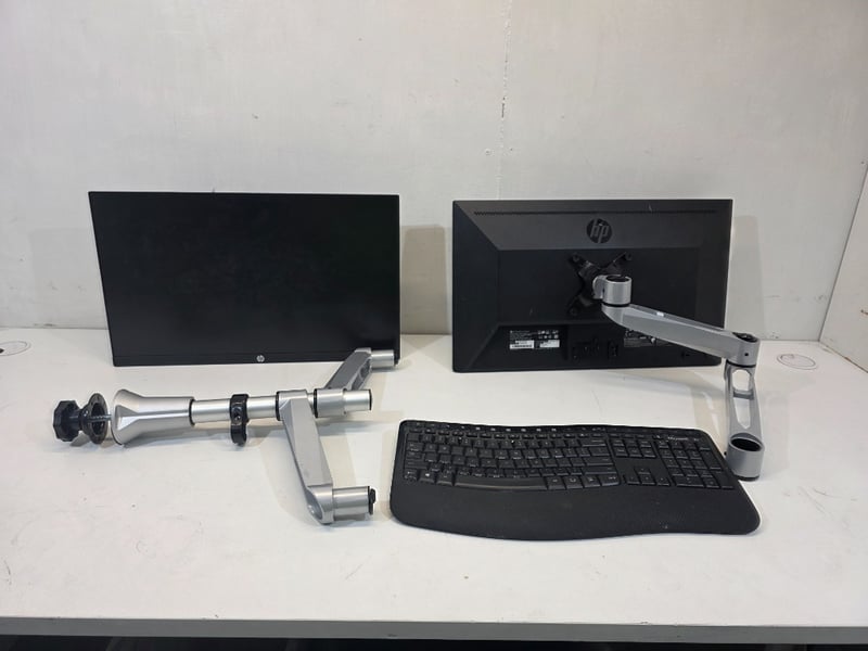 2x HP 244 23.8inch display monitors With Microsoft keyboard, desk stands Power Cord not included SOLD AS LOT