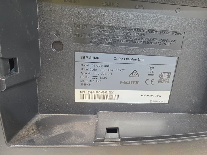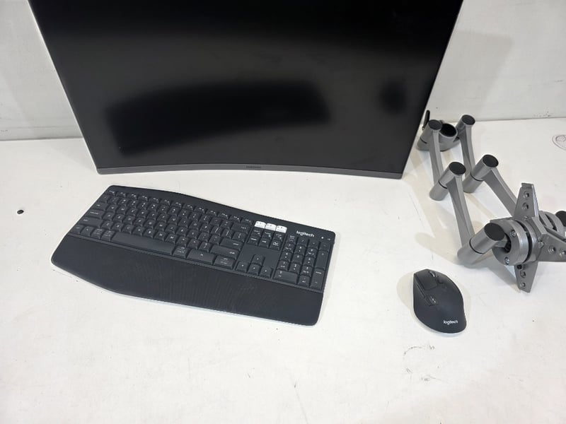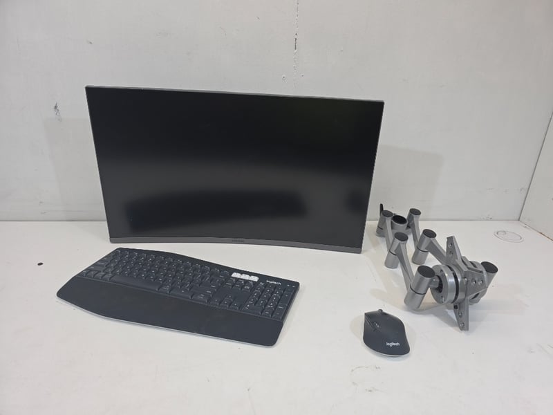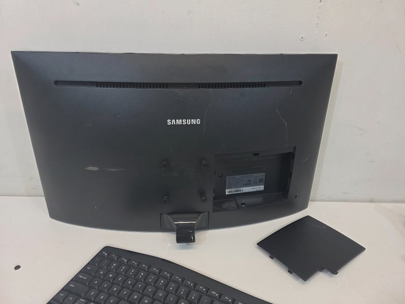 Samsung colour display unit with keyboard mouse and desk stand part Model: c27jg54qqexxy Note: Power Cord not included Untested SOLD AS LOT