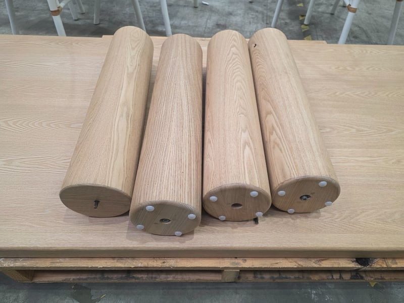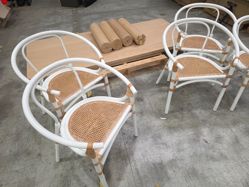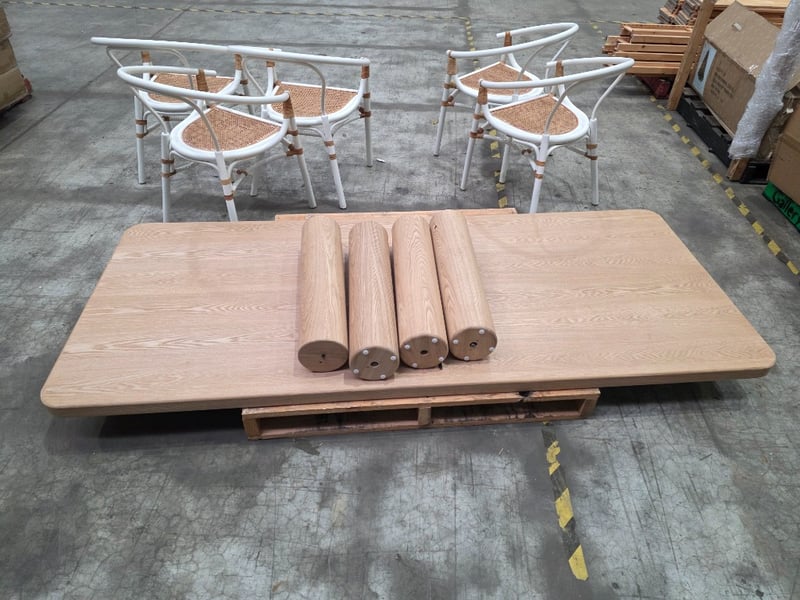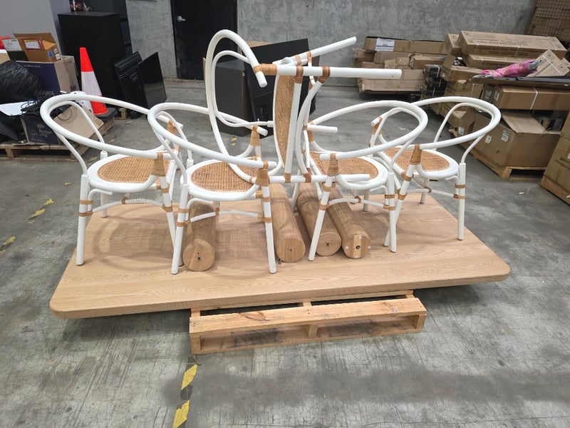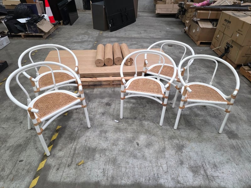 Timber table with 5 white bamboo style chairsTable top Dimensions: 240x100cm