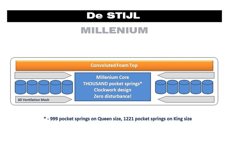 Millenium King - Thousand Springs Mattress - RRP $4,963 The Millenium features a Thousand Springs Core - the latest technology that brings comfort to a completely different level. A Thousand independent pocket springs*, each with individual response system, adjust in a silent clockwork design to any body weight, movement or posture. Combined with a bouncy ventilated Convoluted Foam top, the Millenium provides a smooth non-sinking support with personalised precision, resulting in feelings of lightness and youth, along with complete elimination of partner disturbance.
