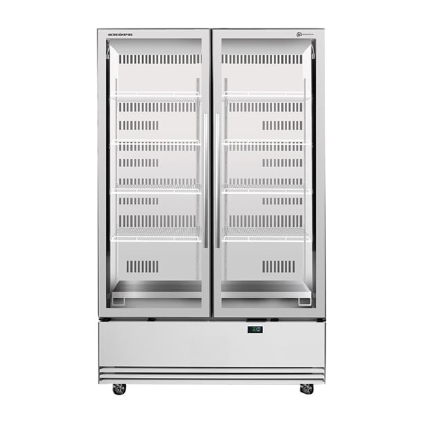 Refrigerator, Vertical Double Glass Door Chiller WhiteCapacity1079LtrDimensions2005(H) x 1280(W) x 795(D)mmMaterialSteel with Powder Coated ColourRefrigerantR290 / GWP 3Supplier Model NumberBME1200N-ATemperature Range1°C to 4°CWeight245kg2 Glass Doors1x 10amp plugStar Rating: 9Energy Efficiency Index: 15.1155Removable activecore cartridge2 x T8 LED tubeMEPS information: M1/3.86 kWh/24h/m2Ventilation: breathes air from lower front, expels to lower rearGEMS Compliant220-240 Volts a.c. 50 Hz single phase supply, 4.5 Amps1079L Capacity+1 to +4 range in 40 degree environments