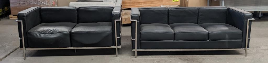 Sofa - Replica Le Corbusier, 3-seat, black vinyl, chrome frame Dims for 2 seater lounge: H: 67 x L: 180 x D:70 Dims for 3 seater lounge: H: 67 x L: 146 x D: 70 Note: may have signs of wear and tear. Sold as a lot.