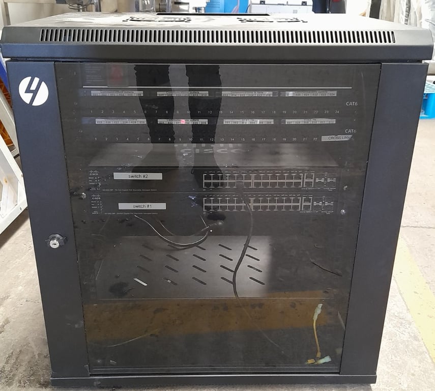 Network Cabinet - 4Cabling, 10U, black steel, enclosed, installed with 2x 24-port patch panels, cable management panel, 2x Cisco SG500-28P 28-port switches