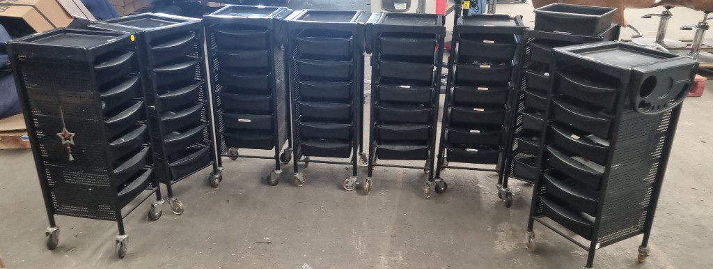 Salon Carts - Black poly, most with 5-6 drawers/trays Note : signs of wear and tear, not cleaned,(some cracked)