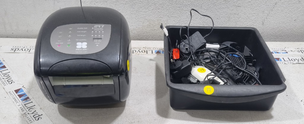 Automatic Hair Foil Dispenser - 24.7 Procare, LED digital controls, S/N: 921625861, Tray of Hair Clippers including - Wahl Super Taper WA8469 corded hair clipper, 40mm, 240V, S/N: 1211210 with assortment of interchangeable heads and 2x Visage 20163903 cordless hair trimmers, DOM: 08/20 with several attachmentssold as lot