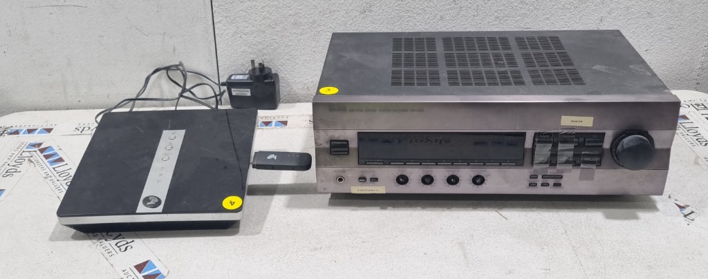 Stereo Receiver - Yamaha RX-396, 120W, S/N: Y658222RT with 3x in-ceiling loud speakers, Netgear Wi-Fi modem sold as lot