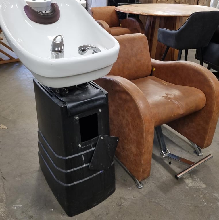 Hair Wash Lounges - Comfortel, tan II leather look upholstery, reclining, white basin with mixer tap and retractable wash head
