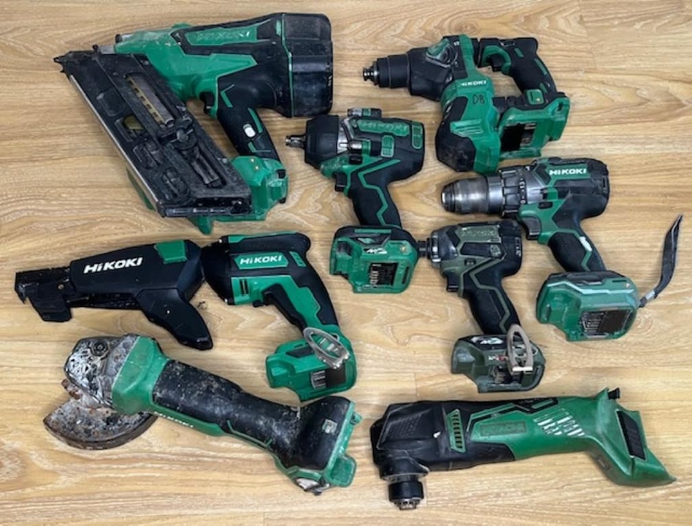 Cordless Hikoki Hitachi tools. 1 x NR1890DBCL strip nailer 18V, 1 x WH 36DC impact driver 36V, 1 x DV 18DC hammer drill 18V, 1 x DH 18DPA rotary hammer drill 18V, 1 x WR 36DE impact wrench 36V, 1 x G 3613DB angle grinder 36V, 1 x CV 18DBL multifunction tool 18V, 1 x plaster screwdriver. Skins only, no batteries. Condition: Not working, untested, for parts or repair