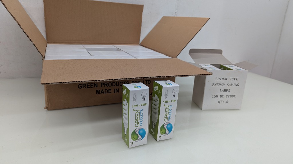 Spiral Type Energy Saving Lamps, Green Products, 15W, 900Lm, Warm White, B22 Base, 6 Globes Per Box, Quantity 12Sold As Lot