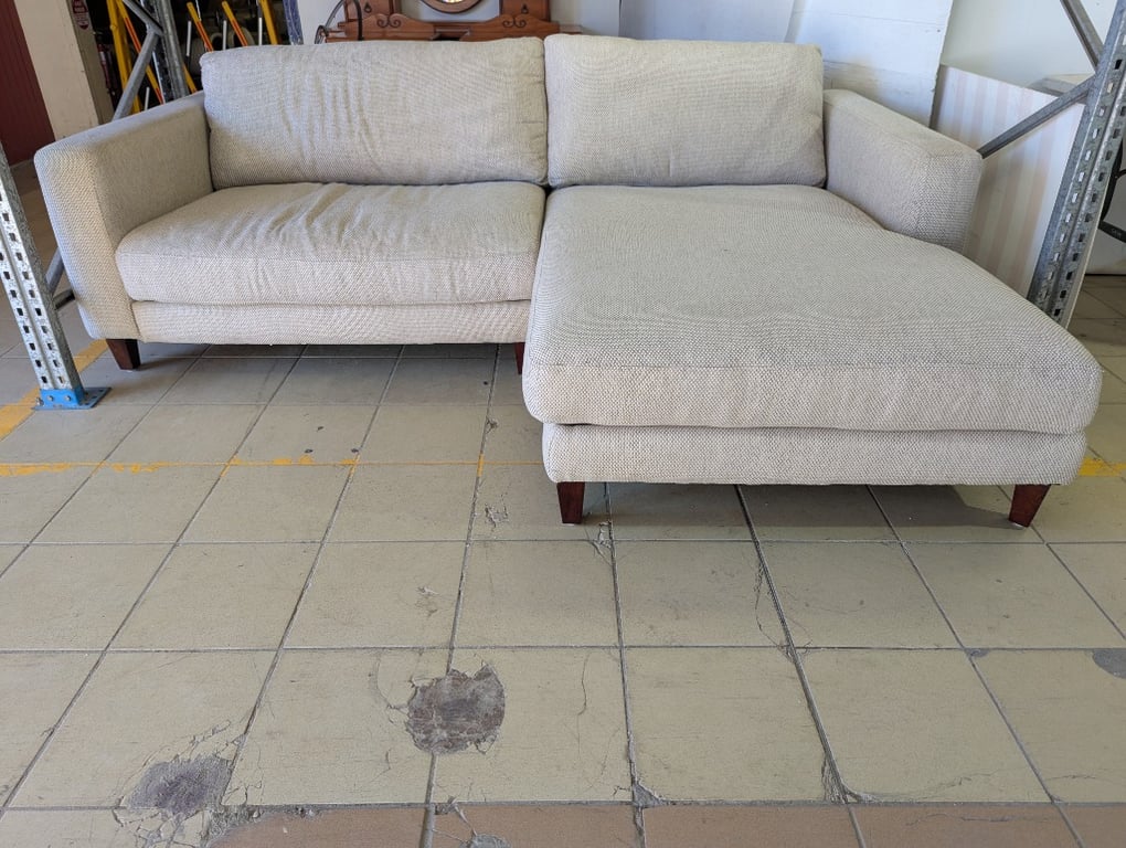 Couch with chaise, timber frame, latte finish upholstery Dimensions: H 85cm x W 245cm x D 190cm