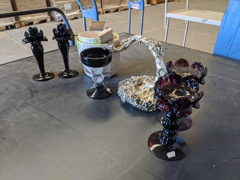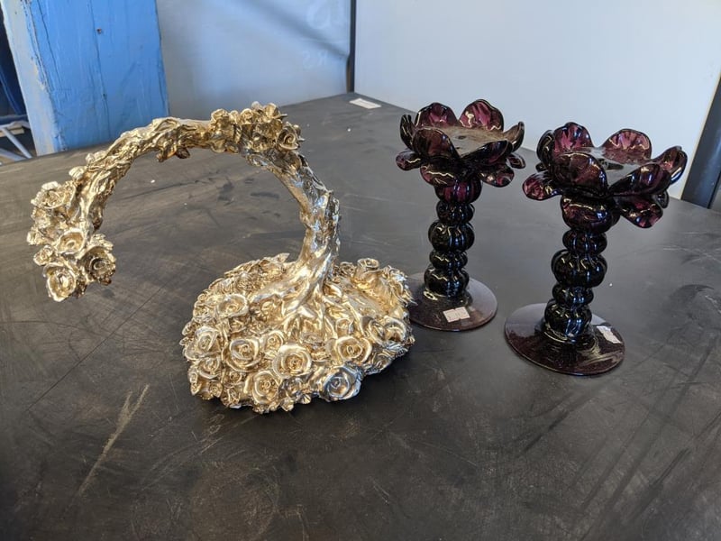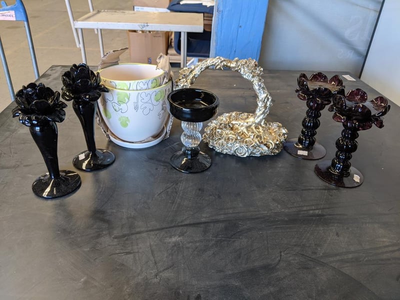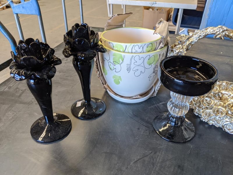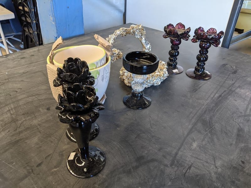 Lot of Ornate Glass & Ceramic Decor - Ceramic Flower Pots - Black Glass Flower-Top Candle Holders - Chrome Tone Rose Garland Sculpture Sold as lot