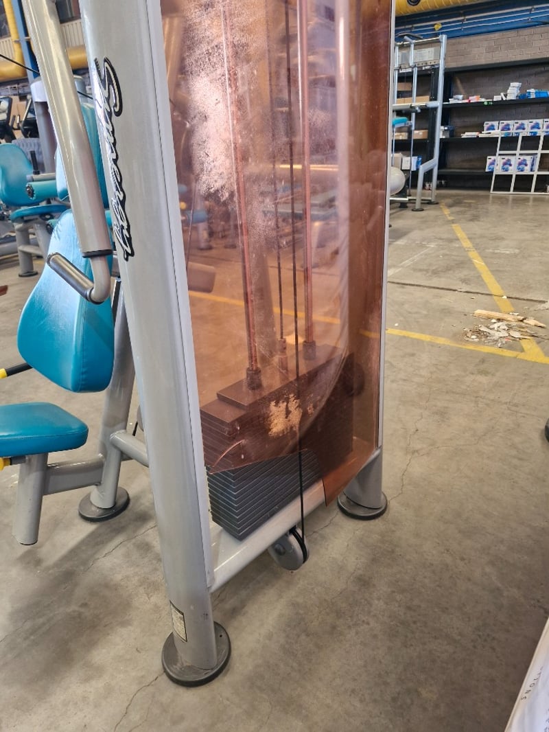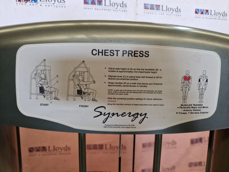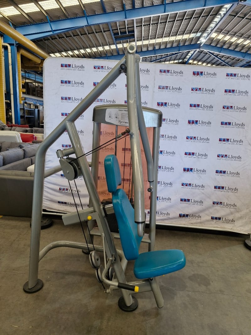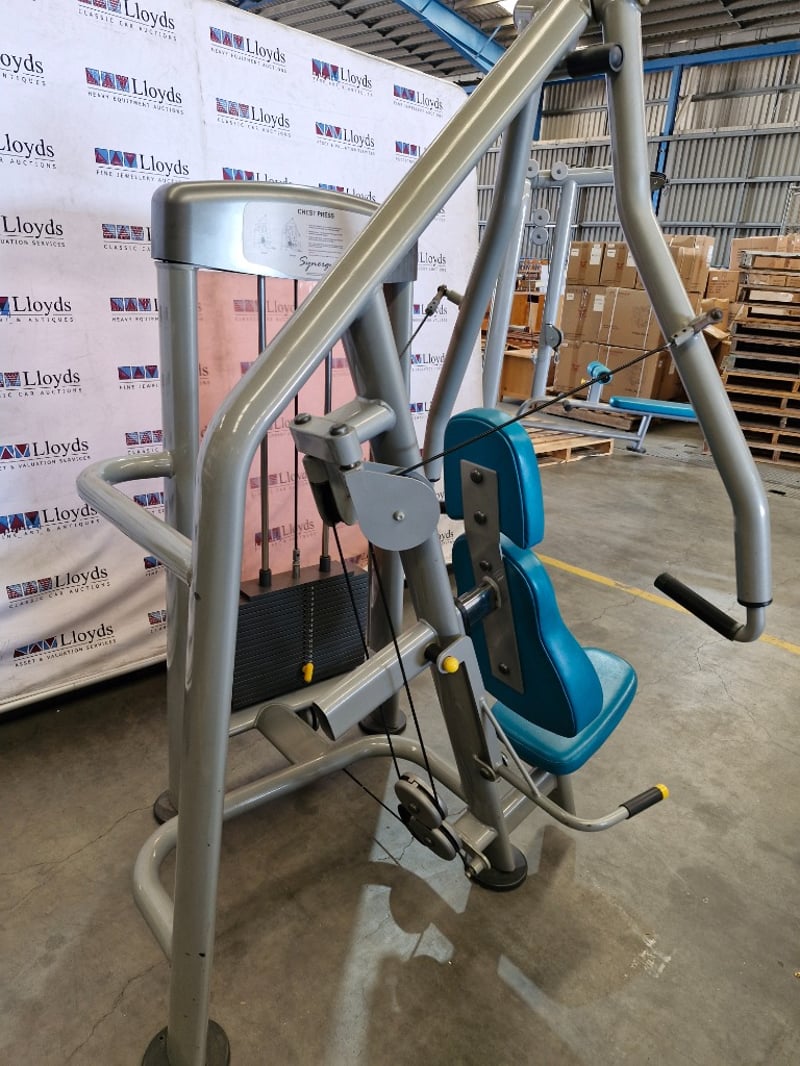 Seated Chest Press Machine, Synergy, includes weight stack.