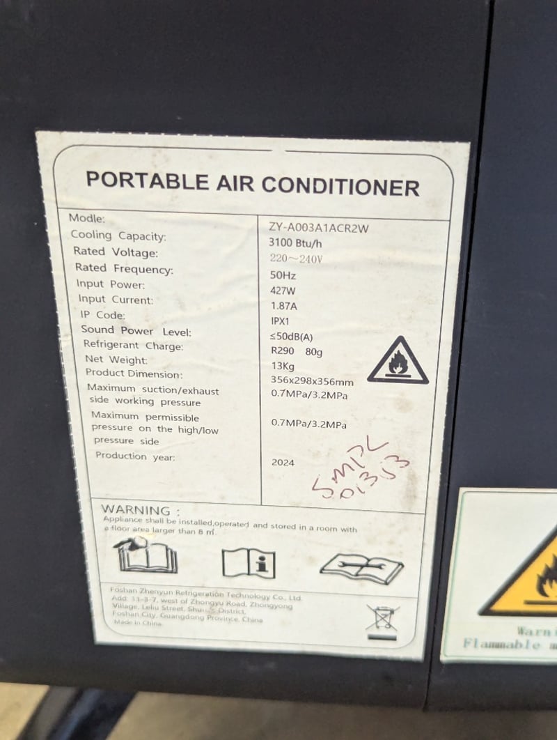Portable Air conditioner, Kickass, 220-240V Dimensions: 44cm H x 33 cm Wx 30 cm D NOTE: Minor Wear