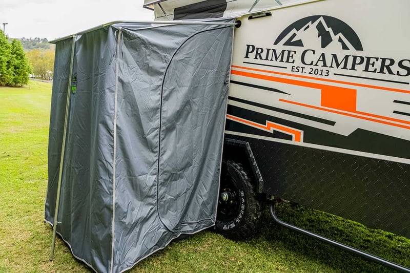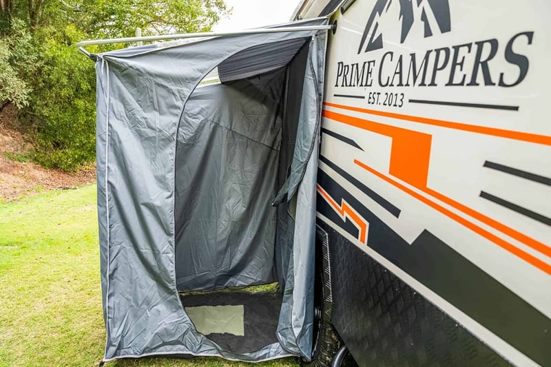 Smart design – Skylight, internal pocket, roll-up blinds, water hose sleeve, mesh floor for draining with middle pvc standing pad.