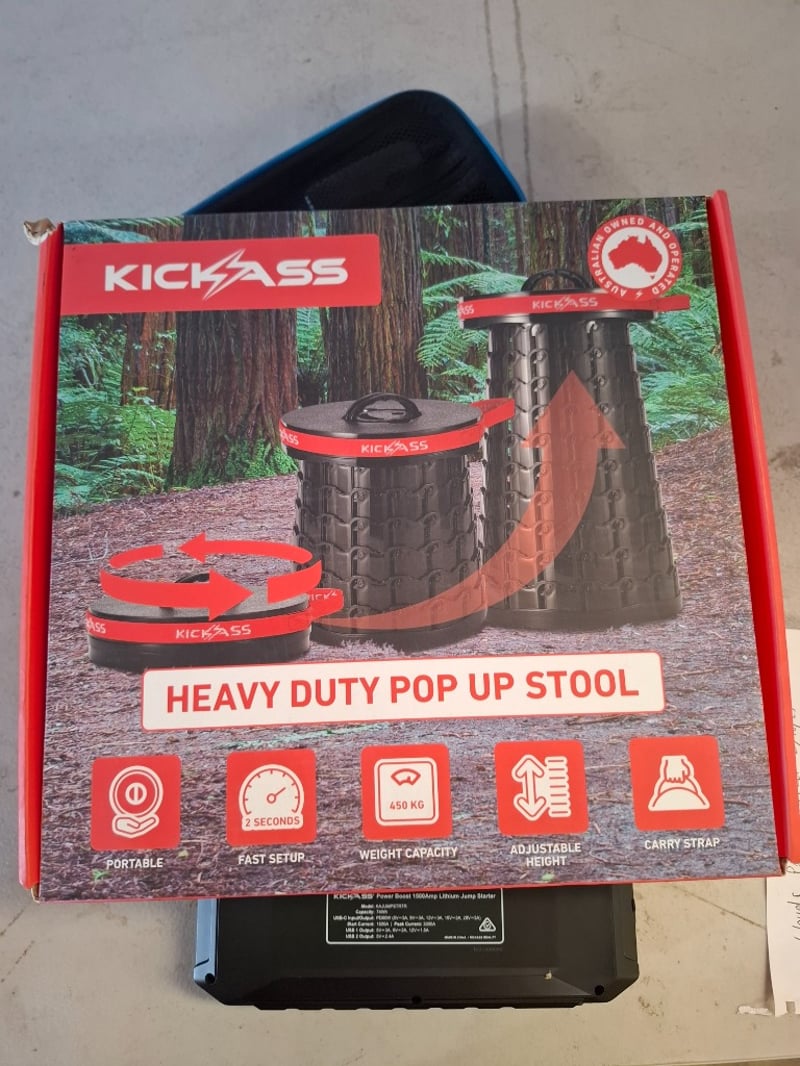 KickAss, Power boost 12v 1500Amp jumper starter Model: KAJUMPSTRTR & pop up stool Model: & Heavy Duty Pop Up stool, Model: KAFTSTOOL1
