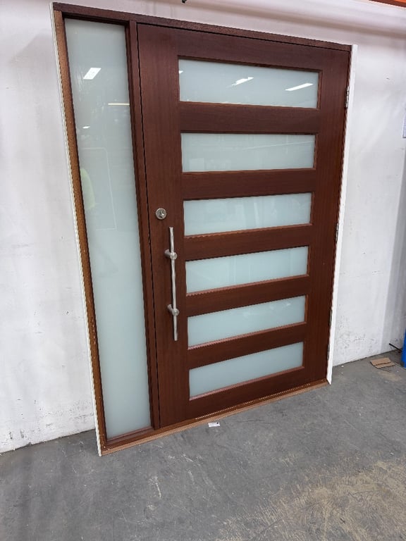 Door, Brown Timber Frame, Frosted white glass, silver handle.
