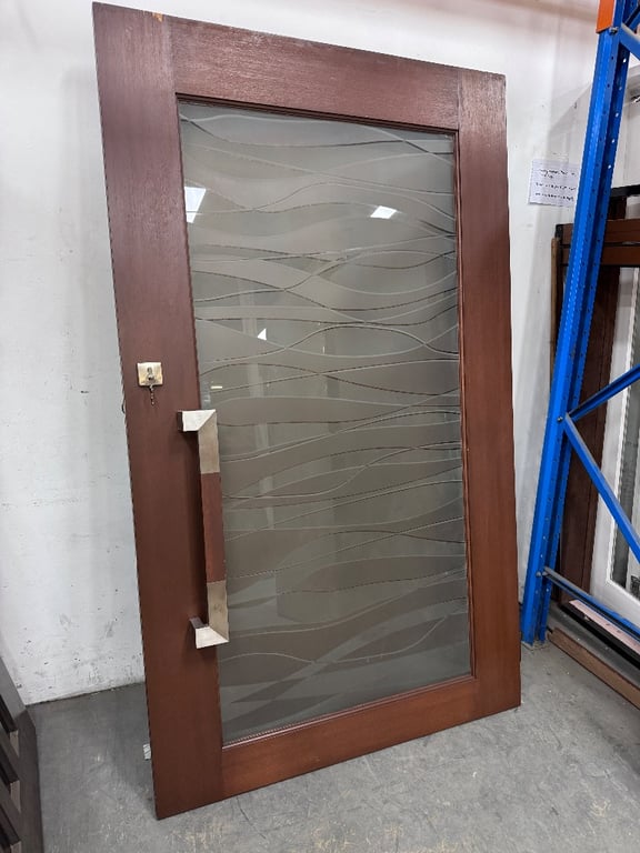 Door, Brown Timber frame, Abstract glass pattern, silver & Timber handle.Approx dimensions.H204 x W120 x D4