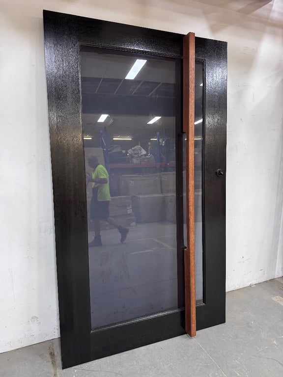 Door, Black Timber frame, Brown Timber handle, tinted glass,