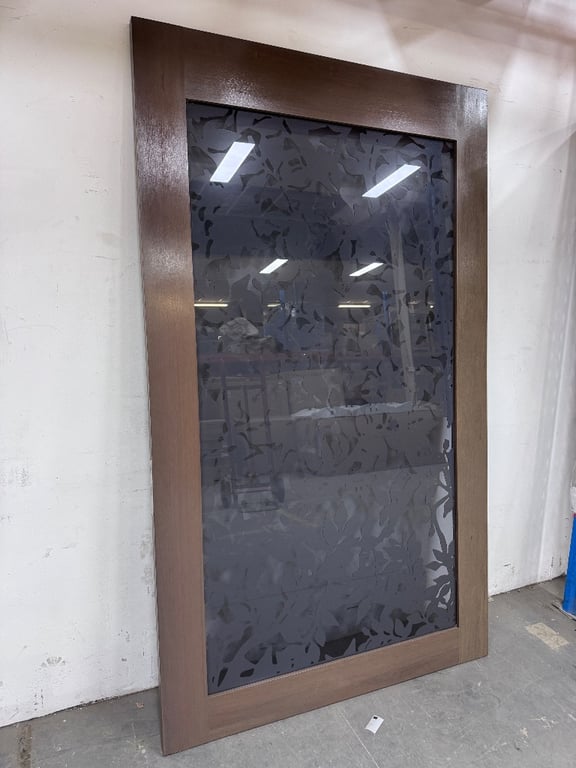 Door, Dark Brown Timber Frame, Dark tinted glass, floral pattern.Approx dimensions H204 x W120 x D4
