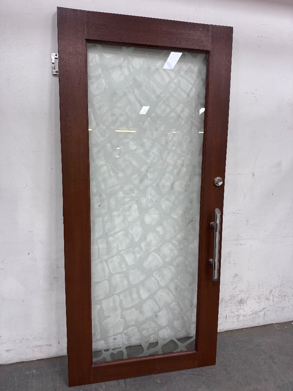 Door, Timber Frame, Abstract Patterned Glass Panel, Silver Handle.