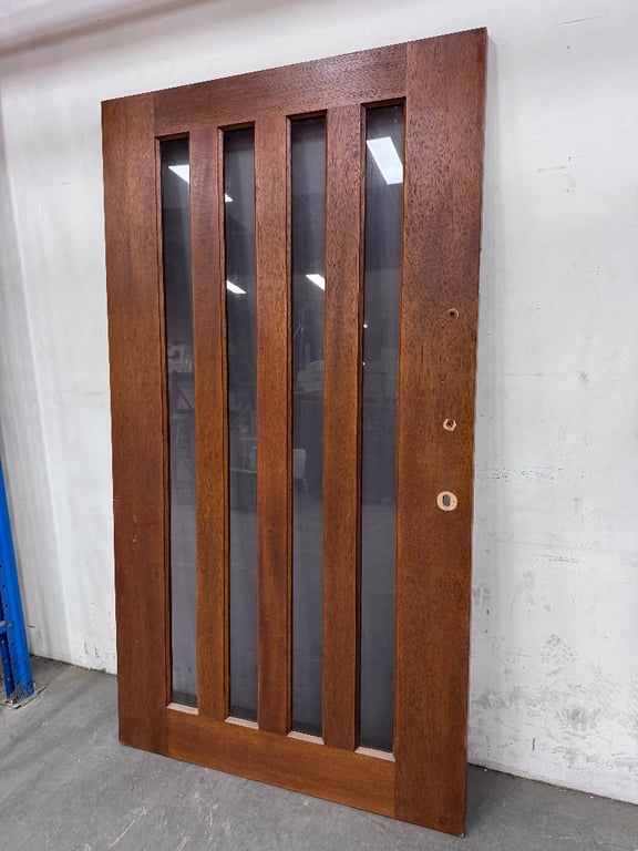 Door, Brown Timber Frame, Striped tinted Glass Pattern.
