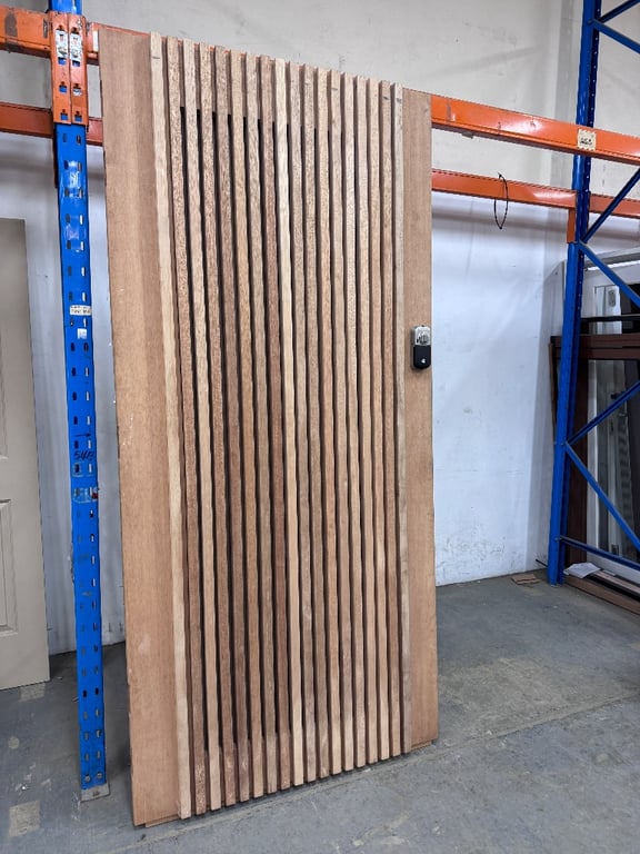 Door, Timber Frame, Striped Timber Slat Pattern, Glass Panel, Electric Key Pad Lock.