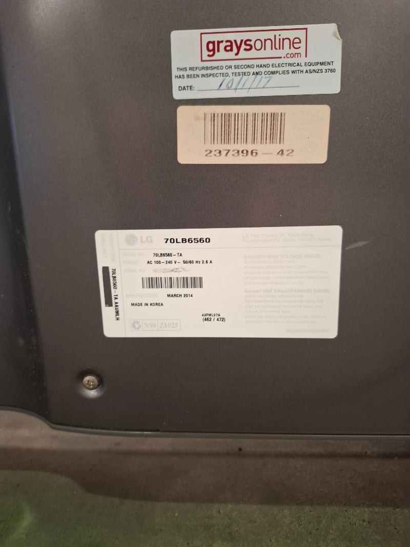 70" (177cm) FULL HD 100HZ WEBOS SMART TVBrand: LGModel: 70LB6560NOTE: INSPECTIONS HIGHLY RECOMMEND