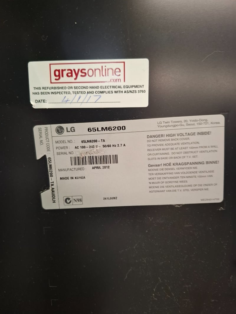 65" (163cm) Full HD 3D LED LCD TVBrand: LGModel: 65LM6200Note: Inspections highly recommend