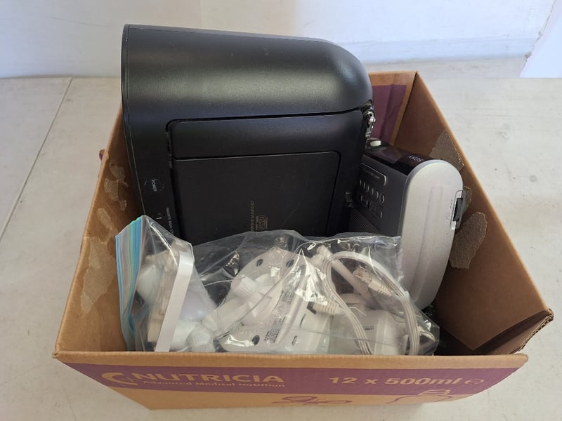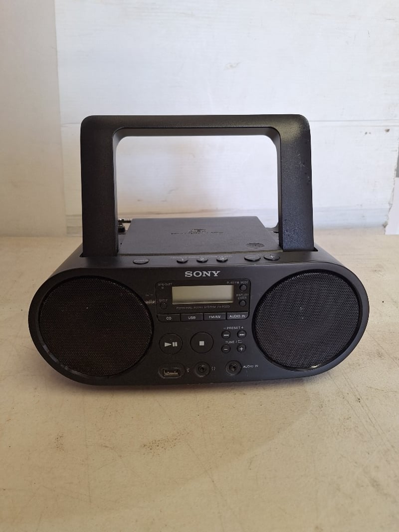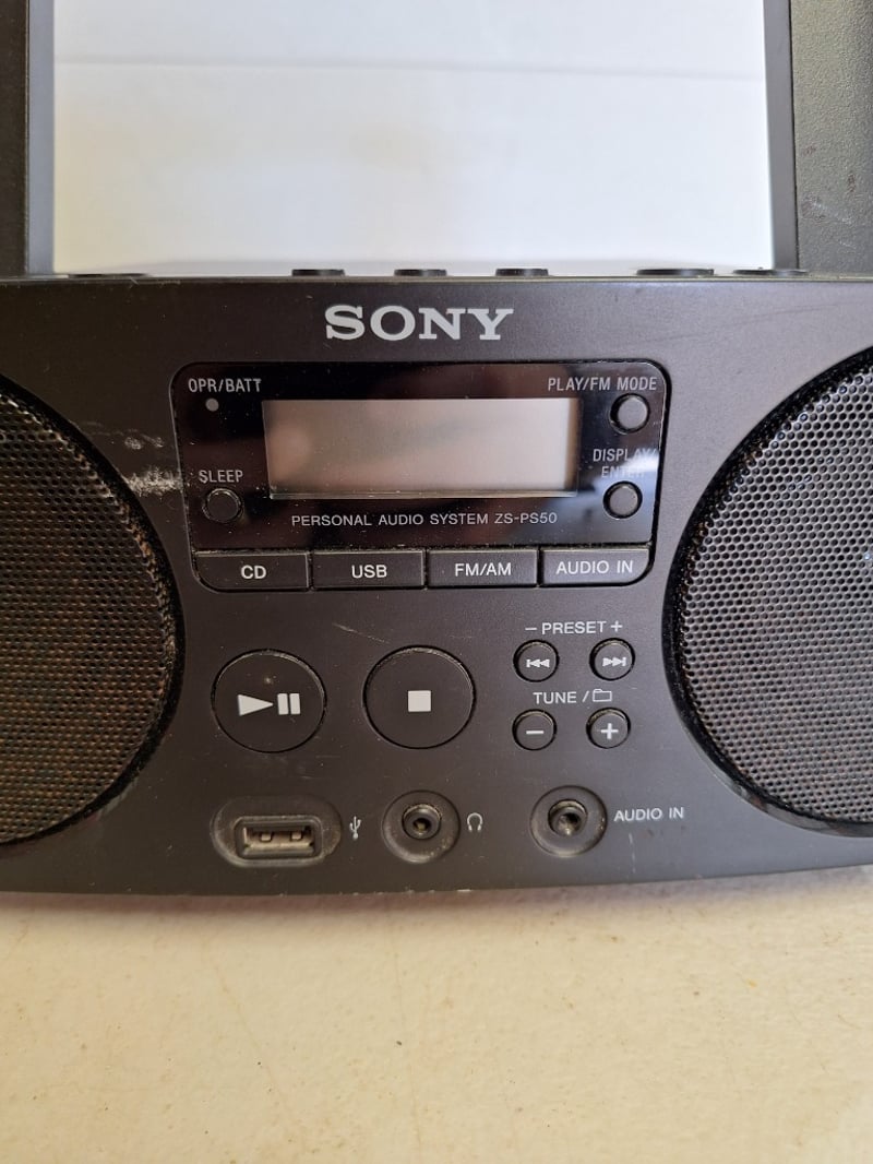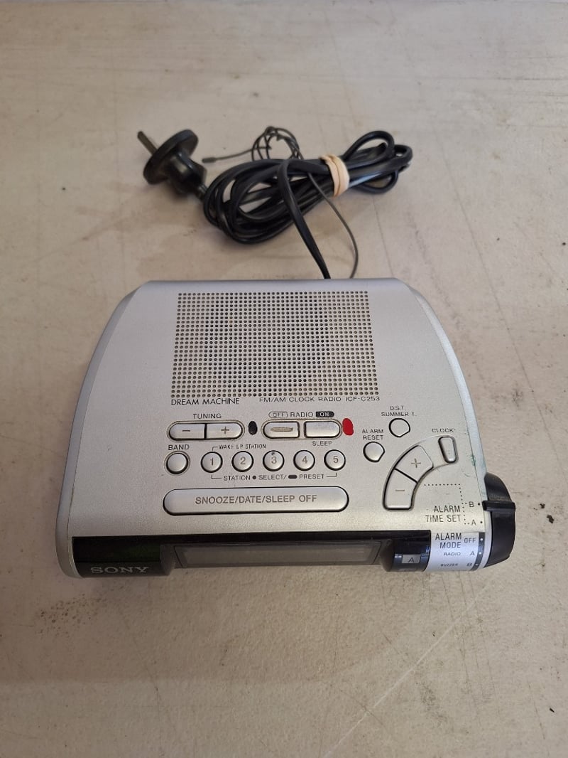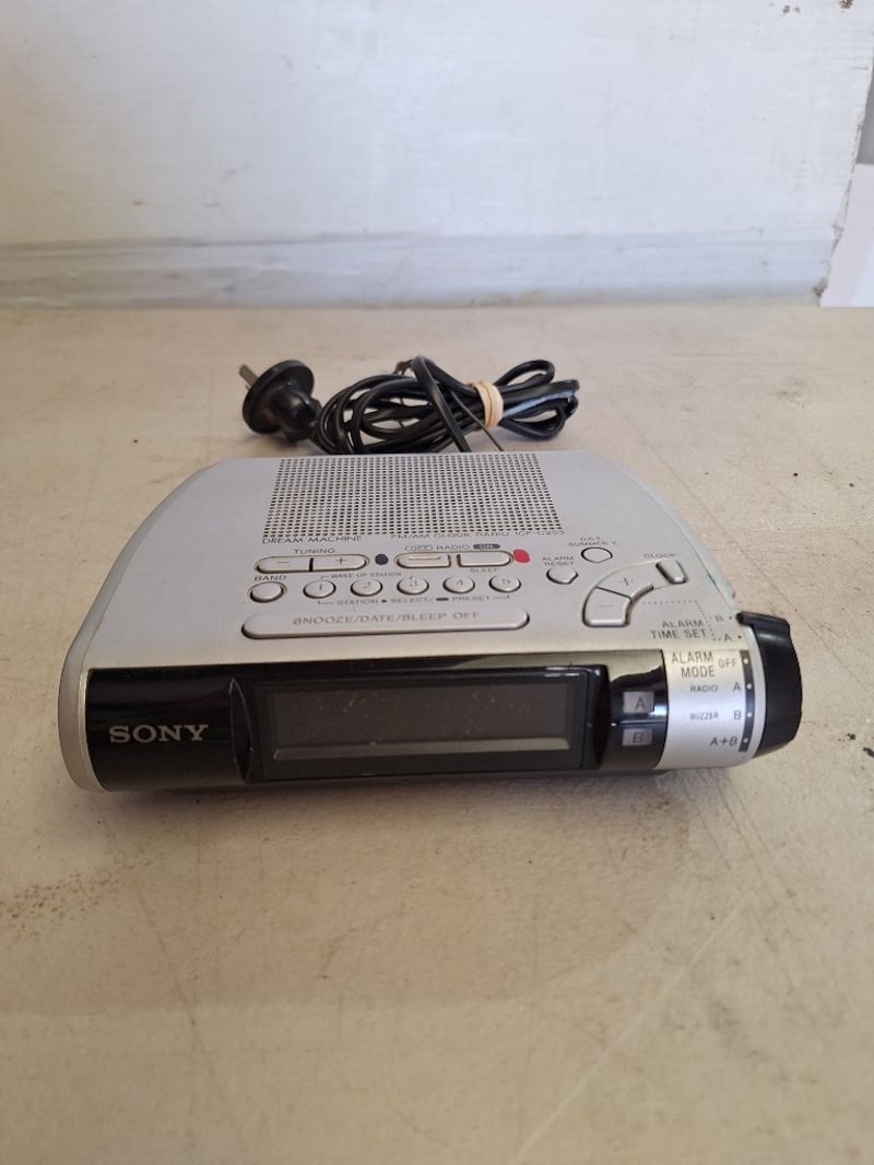Sony ZS-PS50 Portable CD Boombox, Sony ICF-C253 Dream Machine, Security Camera, Dimensions H:30cm W:29cm D:25cm SOLD AS LOT