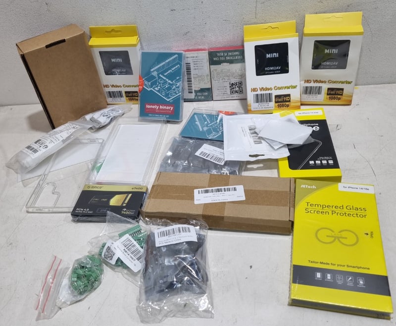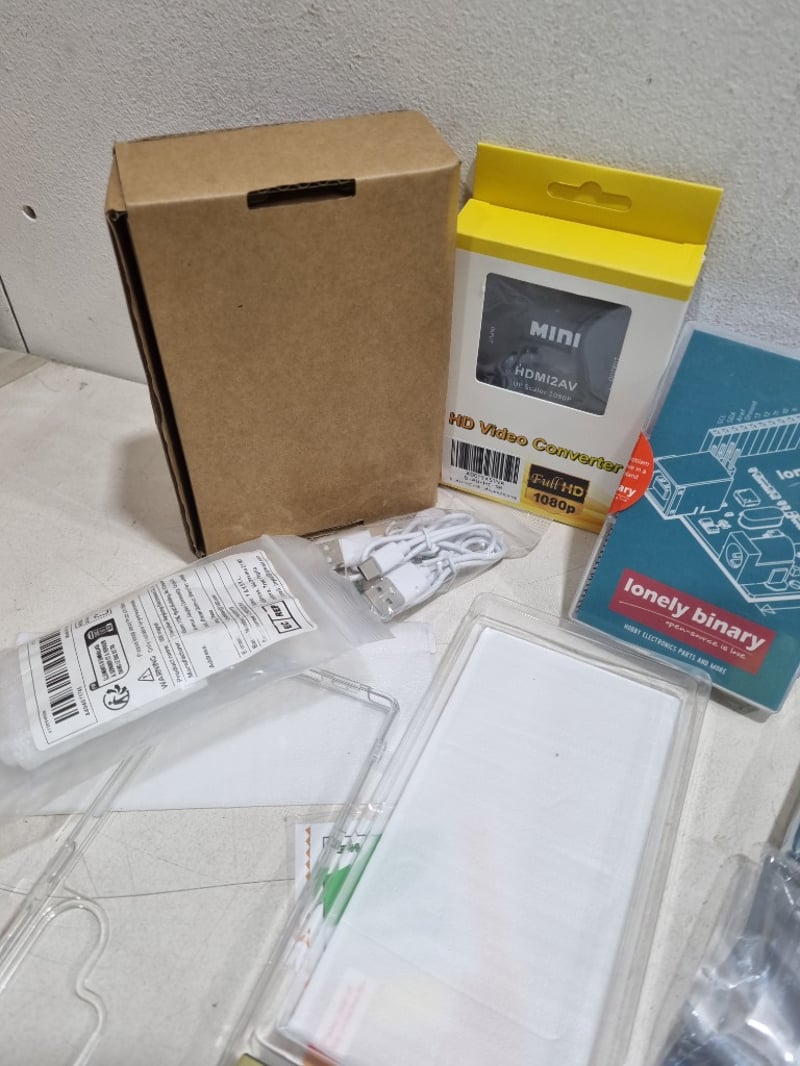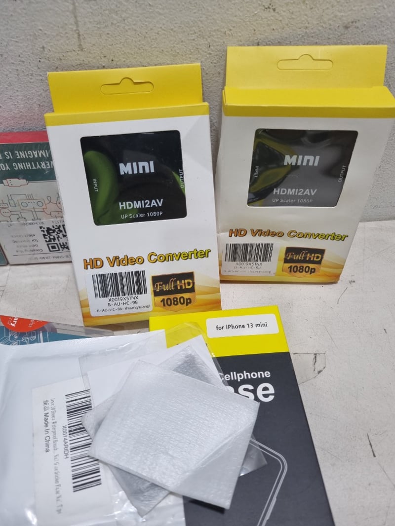 Assorted electronics lot, includes tempered glass protector, hd video convertor and more....... Sold as lot