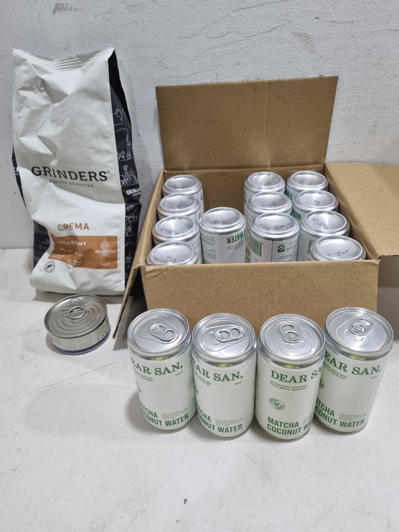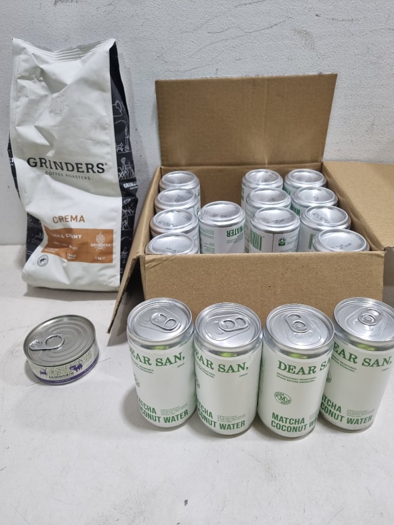 Assorted pantey items lot, grinders coffee beans, matcha coconut water,and Zealanda pate..