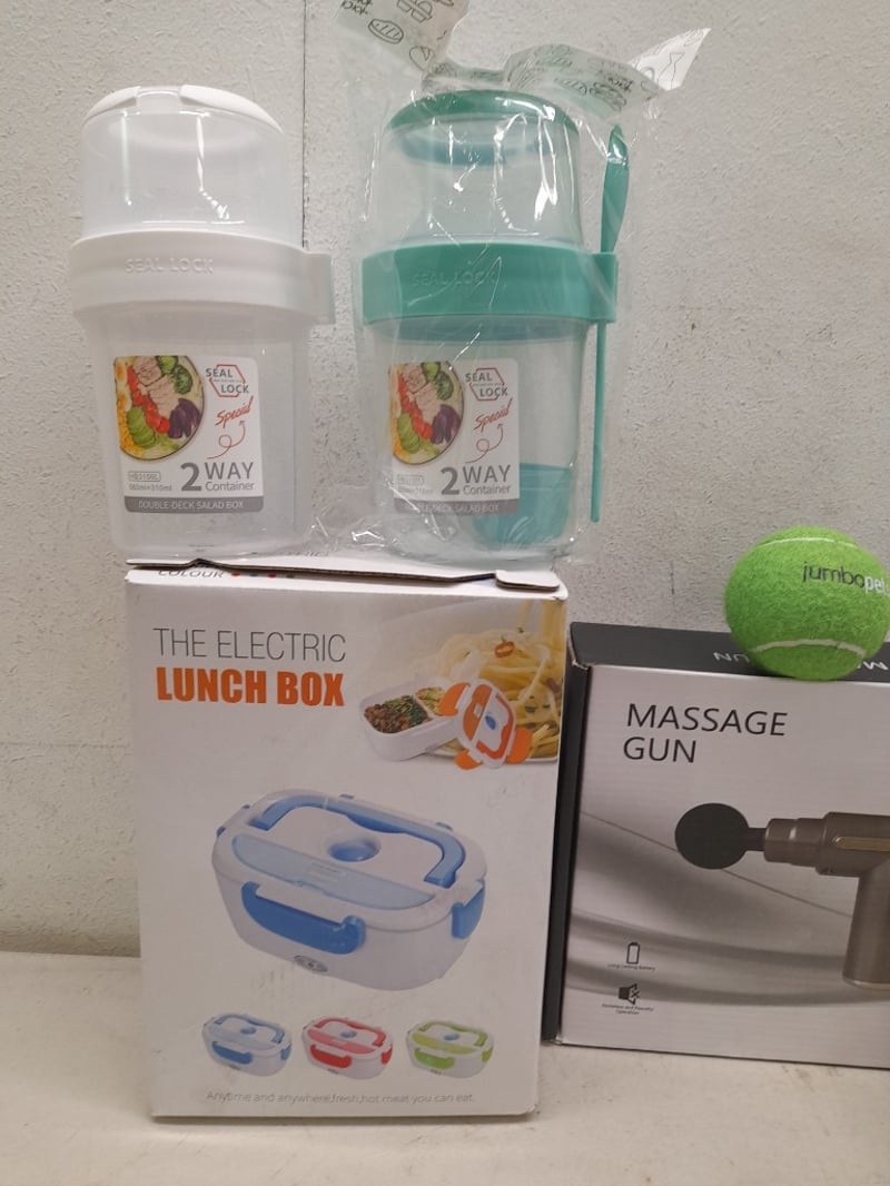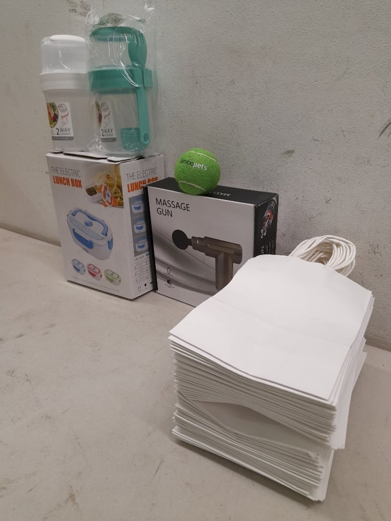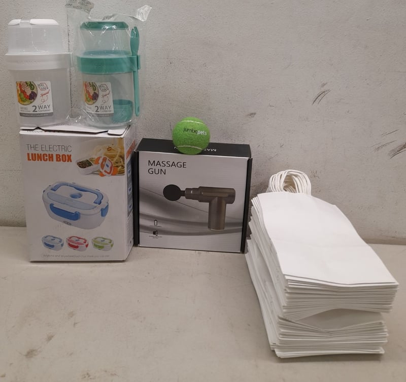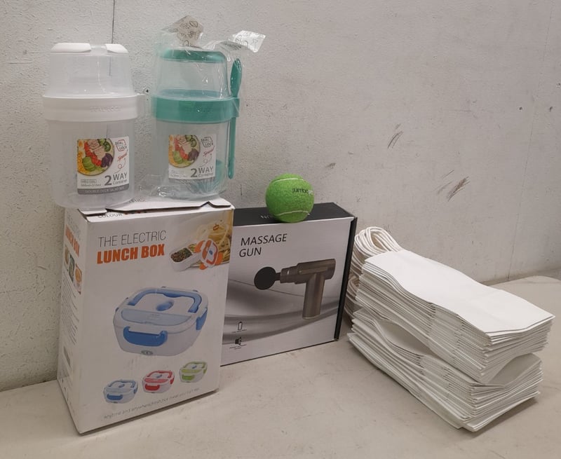 Massage Gun, Electric Lunch Box, Salad Containers & White Gift Bags