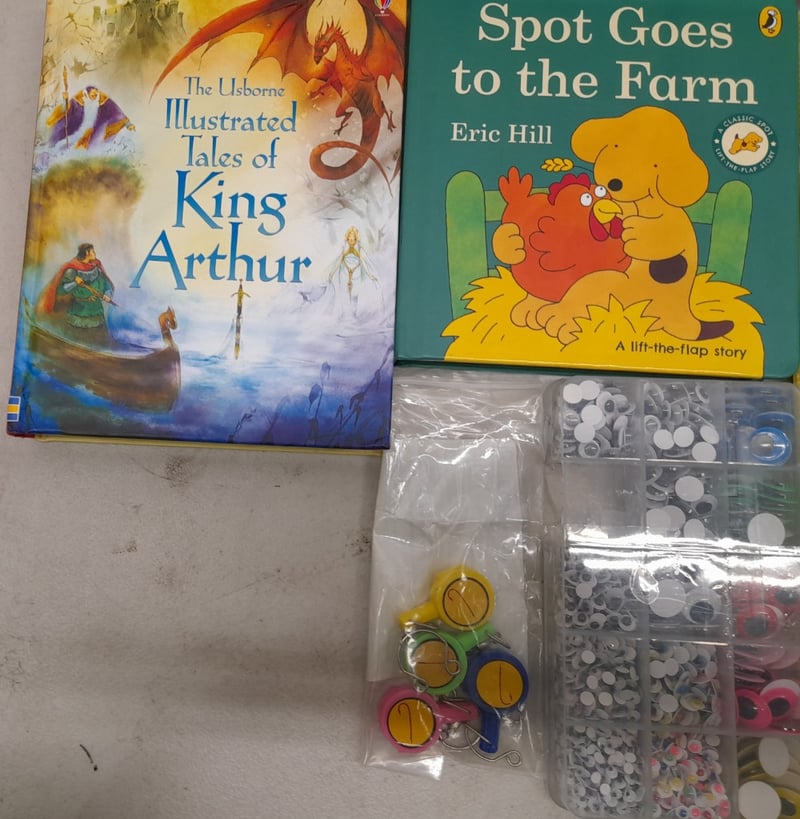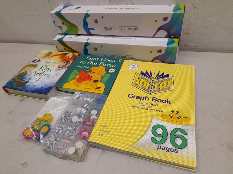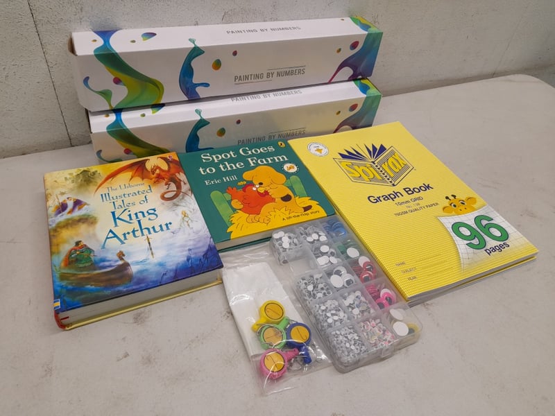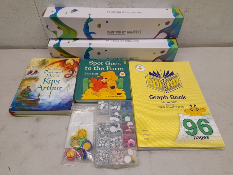 Children's books, x3 work books, x2 painting by numbers, bulk googly eyes, fishing gear Sold as lot