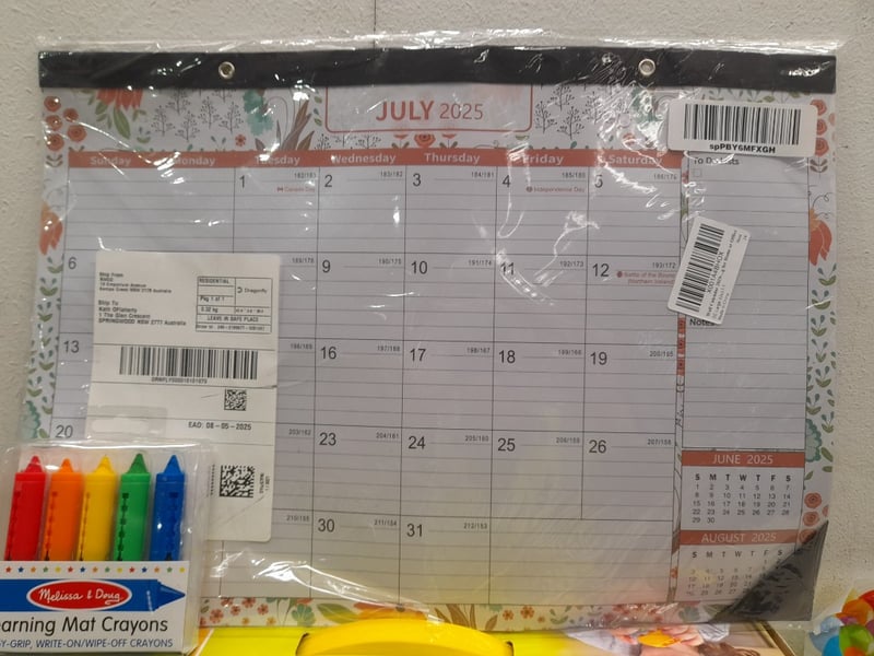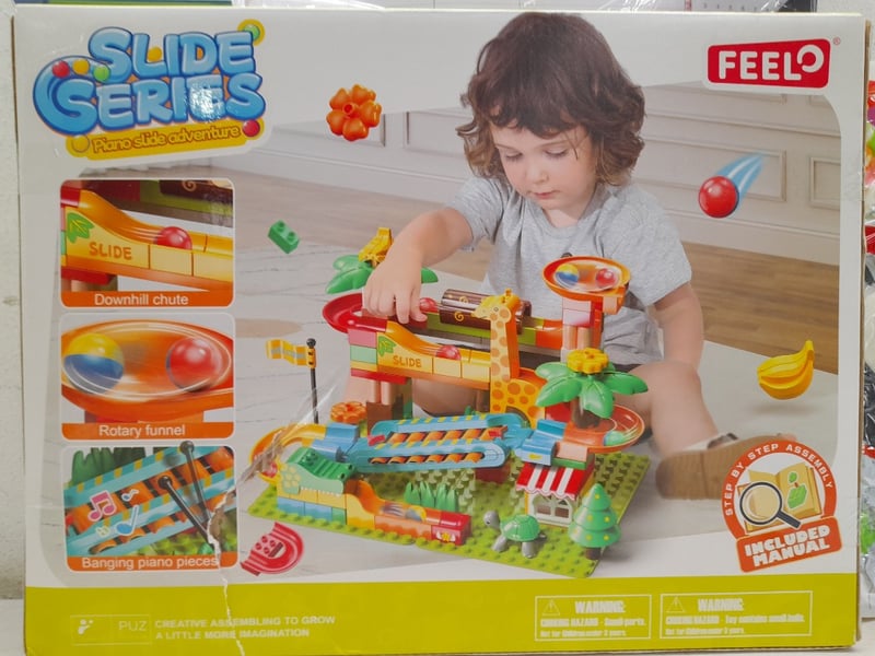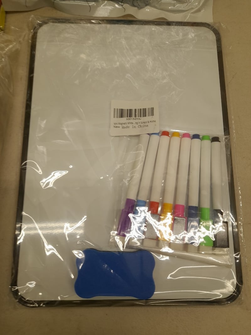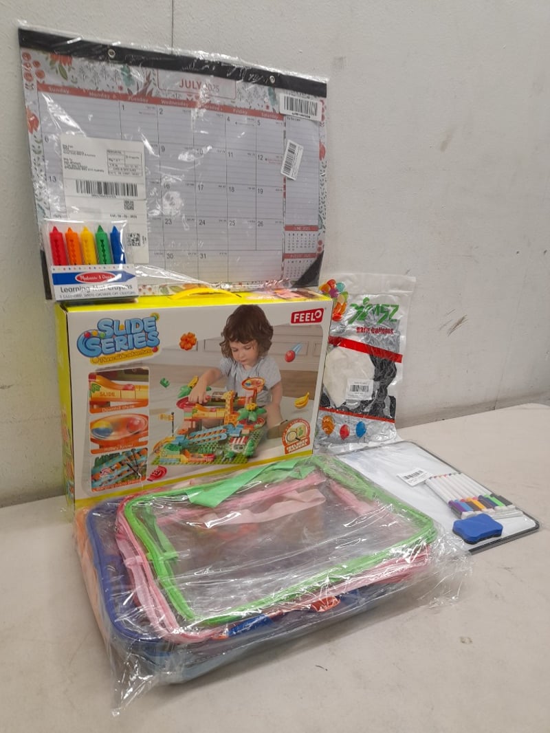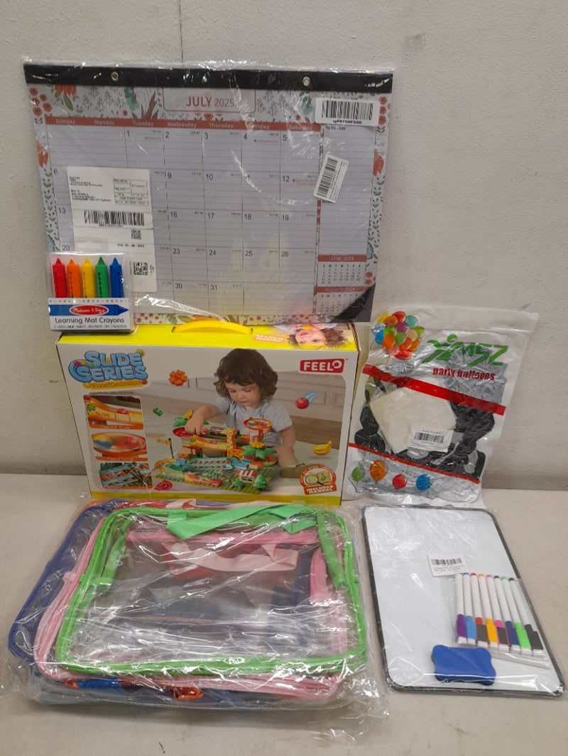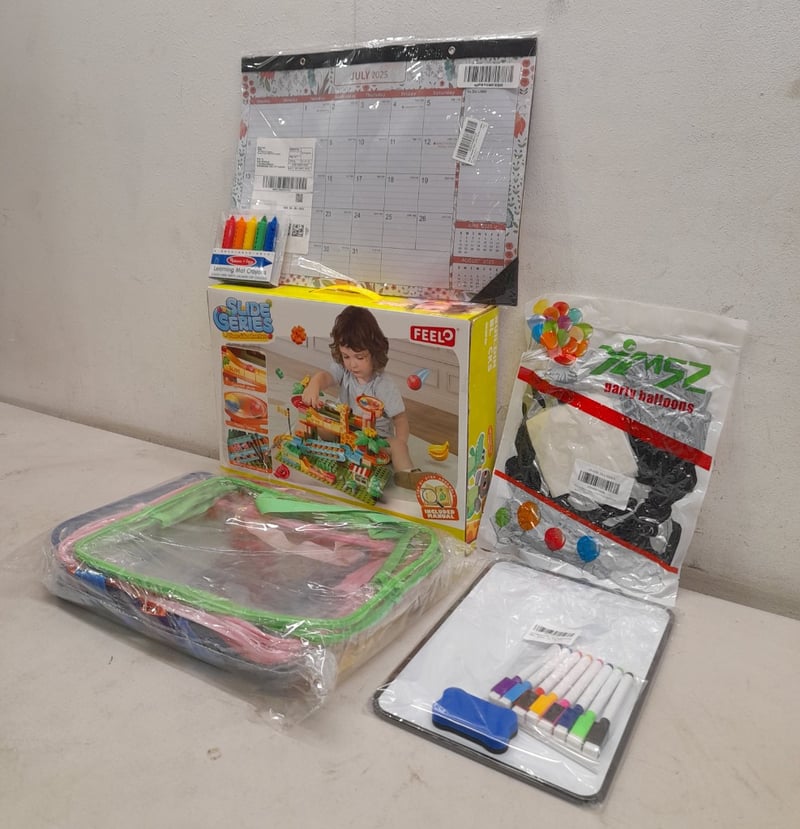 Kids lego set, White board, calendar, crayons, party balloons, coloured clear bags