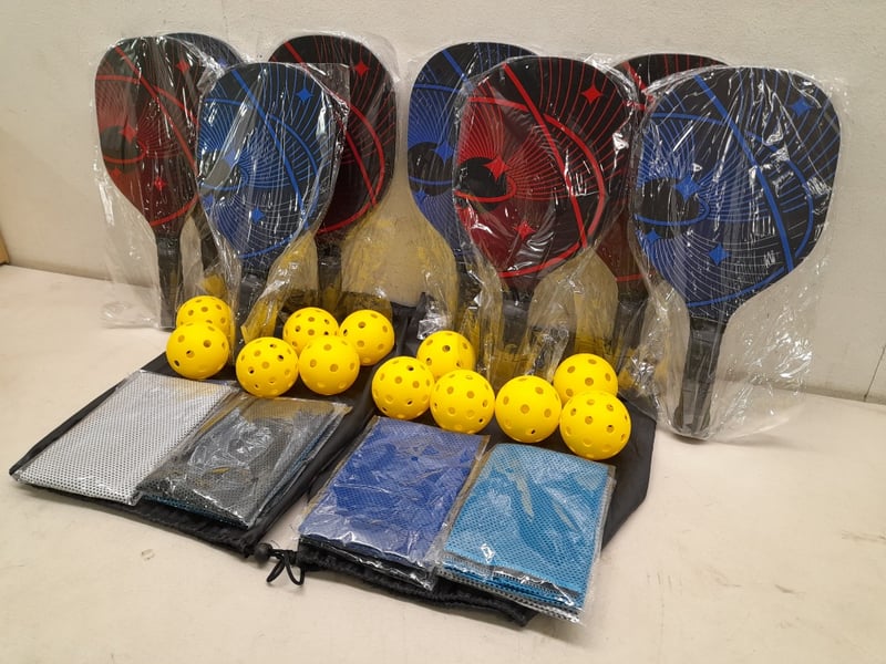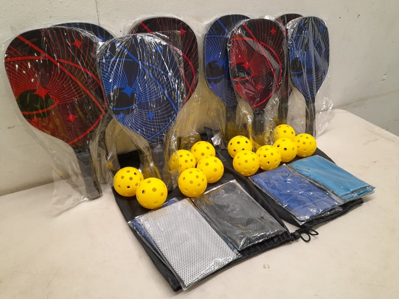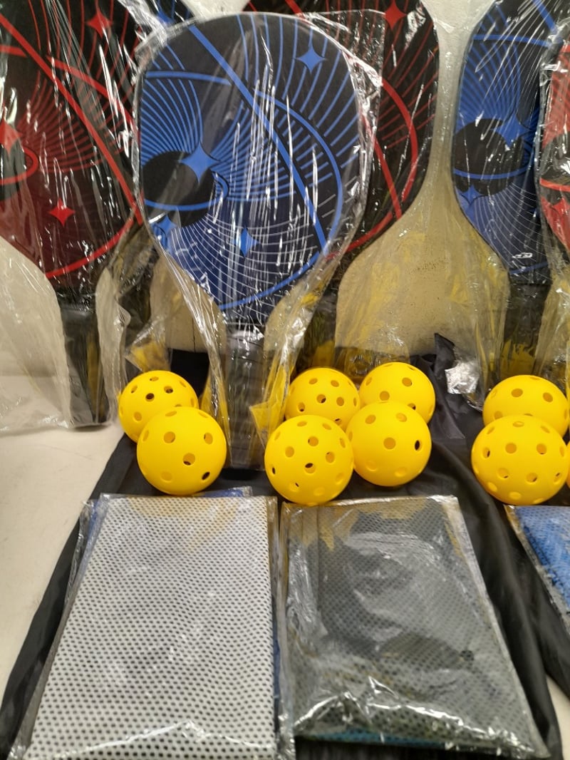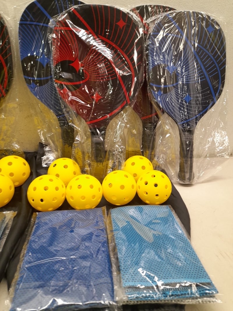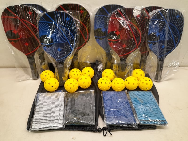Pickleball/Paddleball Rackets, 12 Perforated Balls, & Cooling Towel Sets Sold as lot