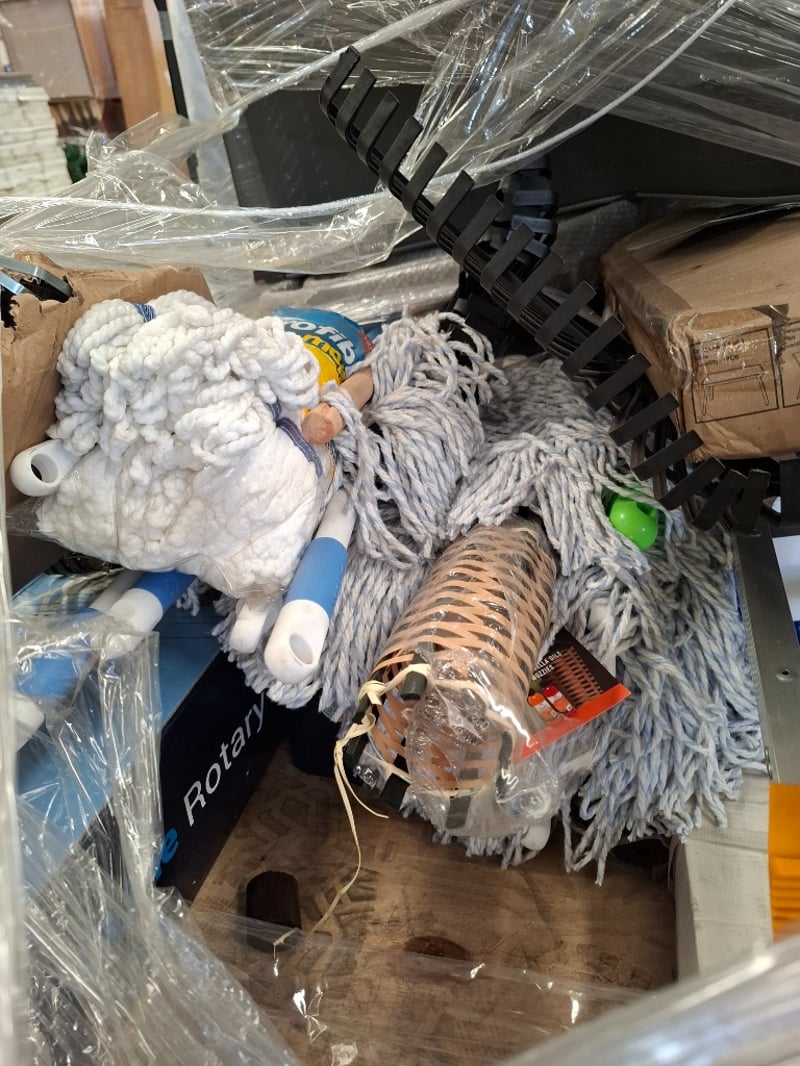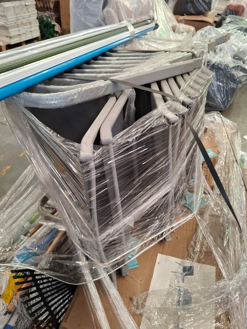 Assorted lot, including chairs, Mops, clothesline, 4 drawer unit & more