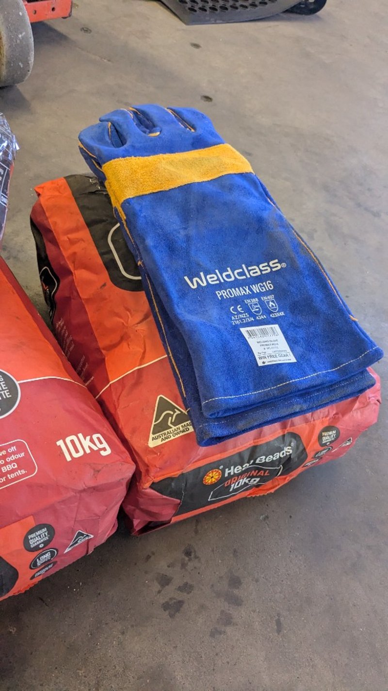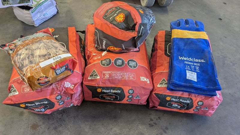 Assorted BBQ Accessories, Includes Welding Gloves, Pecan Wood Chips and Heat Beads, Quantity to Photos