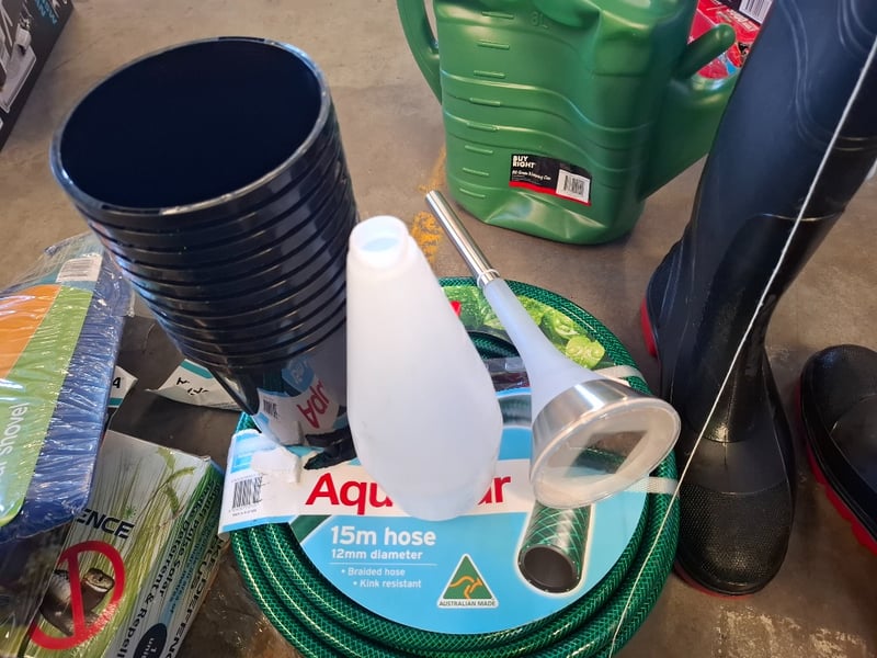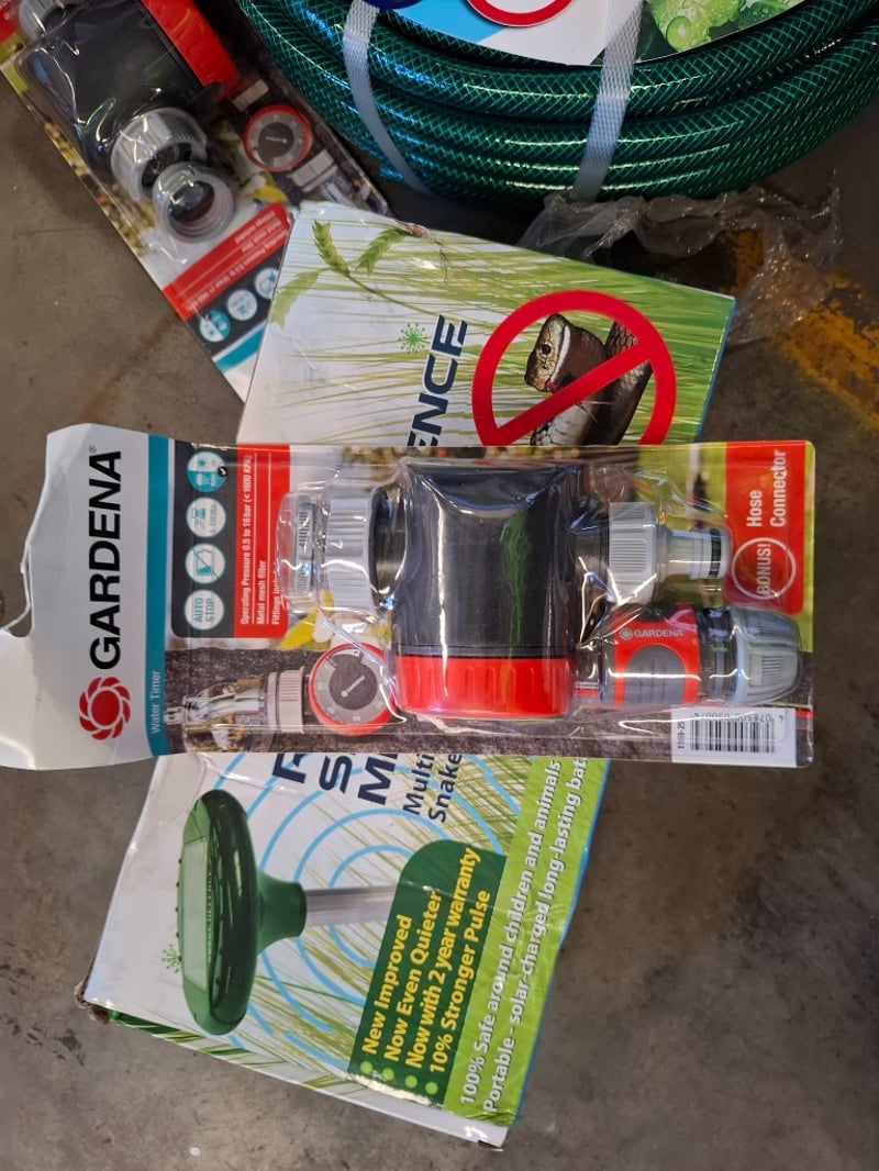 Assorted Gardening, including rubber boots, hose, water timers & moreSold as lot