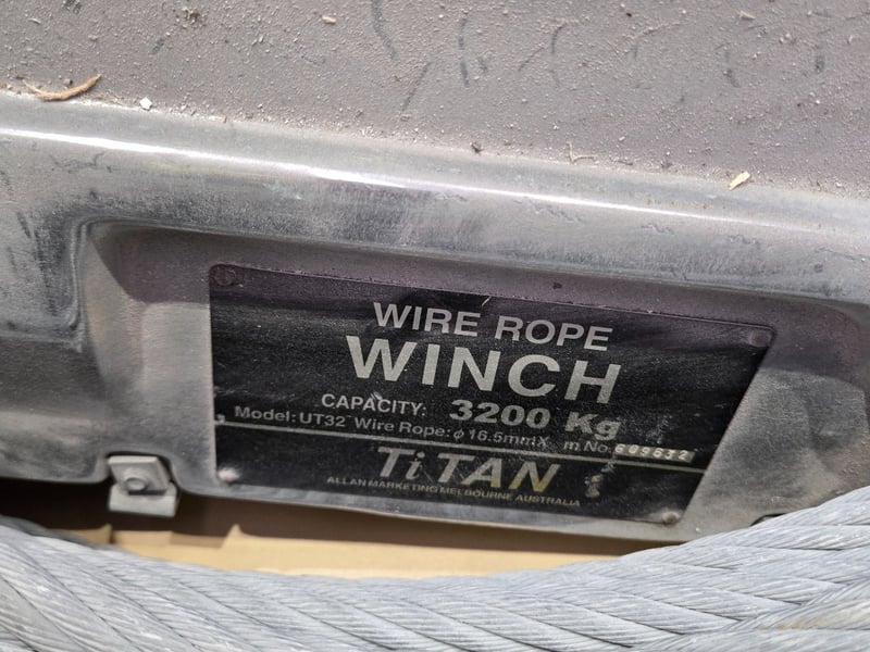 3.2 Ton Titan Wire Winch RopeMake: TitanModel: UT32Wire rope: 16.5 max Serial: 609632Colour: SilverDescription: Includes wooden boxNote: Collections are to commence from Monday 24th and finalise by 28th November , 7.30am to 3.30 pm Daily. NO Collections Thursday 20th & Friday 21st of November & Weekends. Lifting Available Onsite. Items not collected may be deemed abandoned.Full PPE required by all Transport Drivers and Bidders attending site(No Exceptions), Long Pants and Shirts, Safety Shoes or Boots, High Vise, and Hard Hat.All Auction Enquires please contact Mark David 0437318344, Site Collections contact Jason Moorefoot 0491 743028.Auction Site Address: Seabreeze Pde ,Northshore, Geelong, Vic.