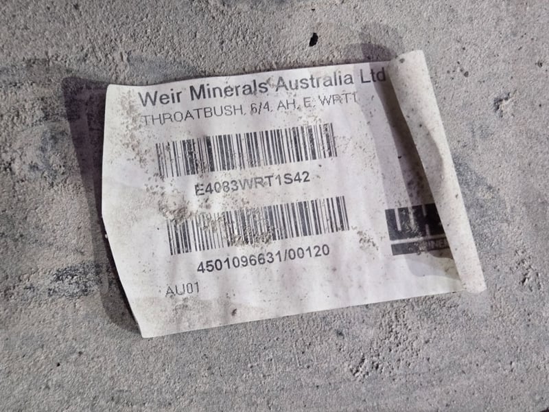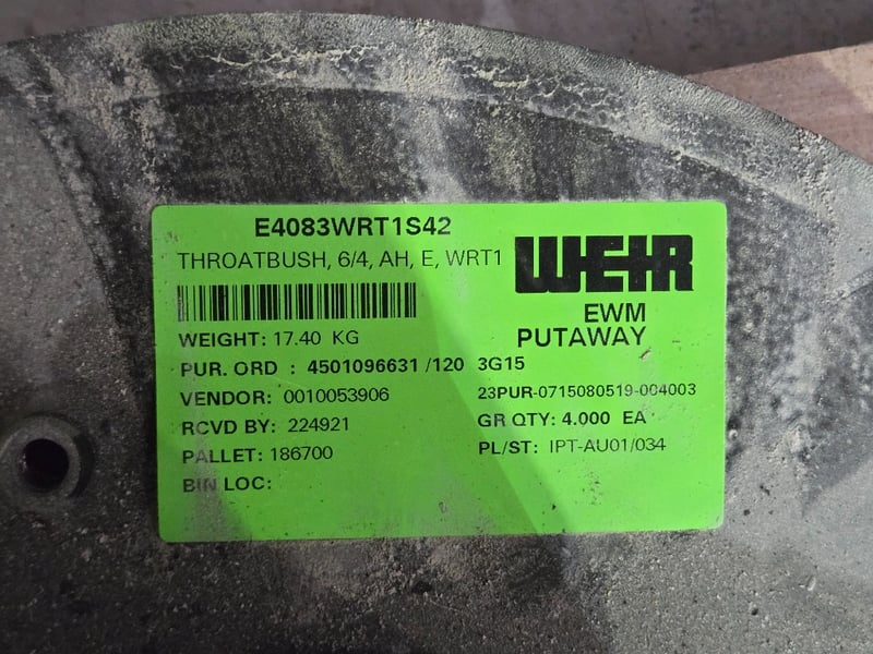 Throatbush 6/4 plate parts pallet Make: WeirSold as a lotNote: Collections are to commence from Monday 24th and finalise by 28th November , 7.30am to 3.30 pm Daily. NO Collections Thursday 20th & Friday 21st of November & Weekends. Lifting Available Onsite. Items not collected may be deemed abandoned.Full PPE required by all Transport Drivers and Bidders attending site(No Exceptions), Long Pants and Shirts, Safety Shoes or Boots, High Vise, and Hard Hat.All Auction Enquires please contact Mark David 0437318344, Site Collections contact Jason Moorefoot 0491 743028.Auction Site Address: Seabreeze Pde ,Northshore, Geelong, Vic.