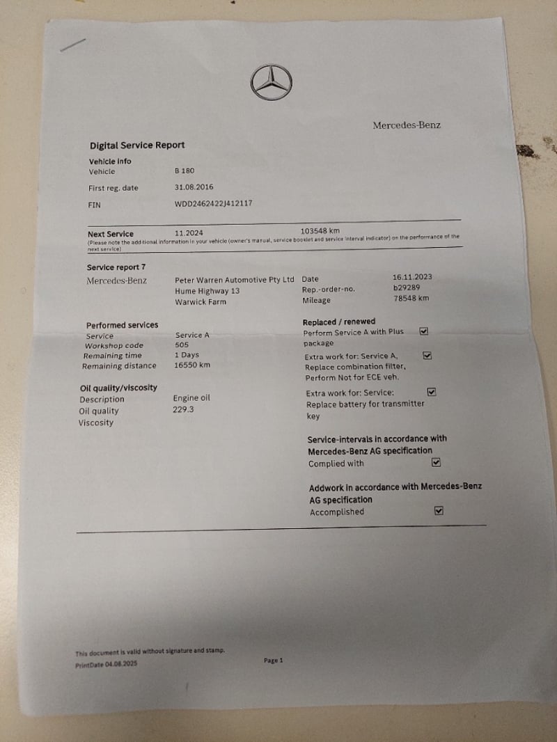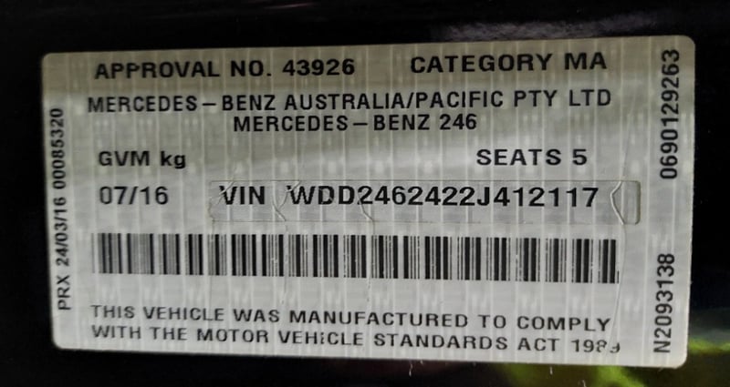 2016 Mercedes-Benz B180 Year: 2016Make: Mercedes-BenzModel: B180Body: 4-Door HatchDrive Type: Front wheel driveOdometer: Indicating 96,019 KilometersEngine: 1.6 PetrolTransmission: AutomaticColour: BlackSeats: 5Description/extras: Air Conditioning, Power windows, SRS, Leather interior, Alloy wheels, Sunroof, Reverse camera, Central locking, CD player. Serviced 3 months ago, invoice provided. VIN: WDD2462422J412117ENG No: 27091031027283 AS PER PPSR(Key #4A Marple)Lloyds stock #1026283+1#PCV